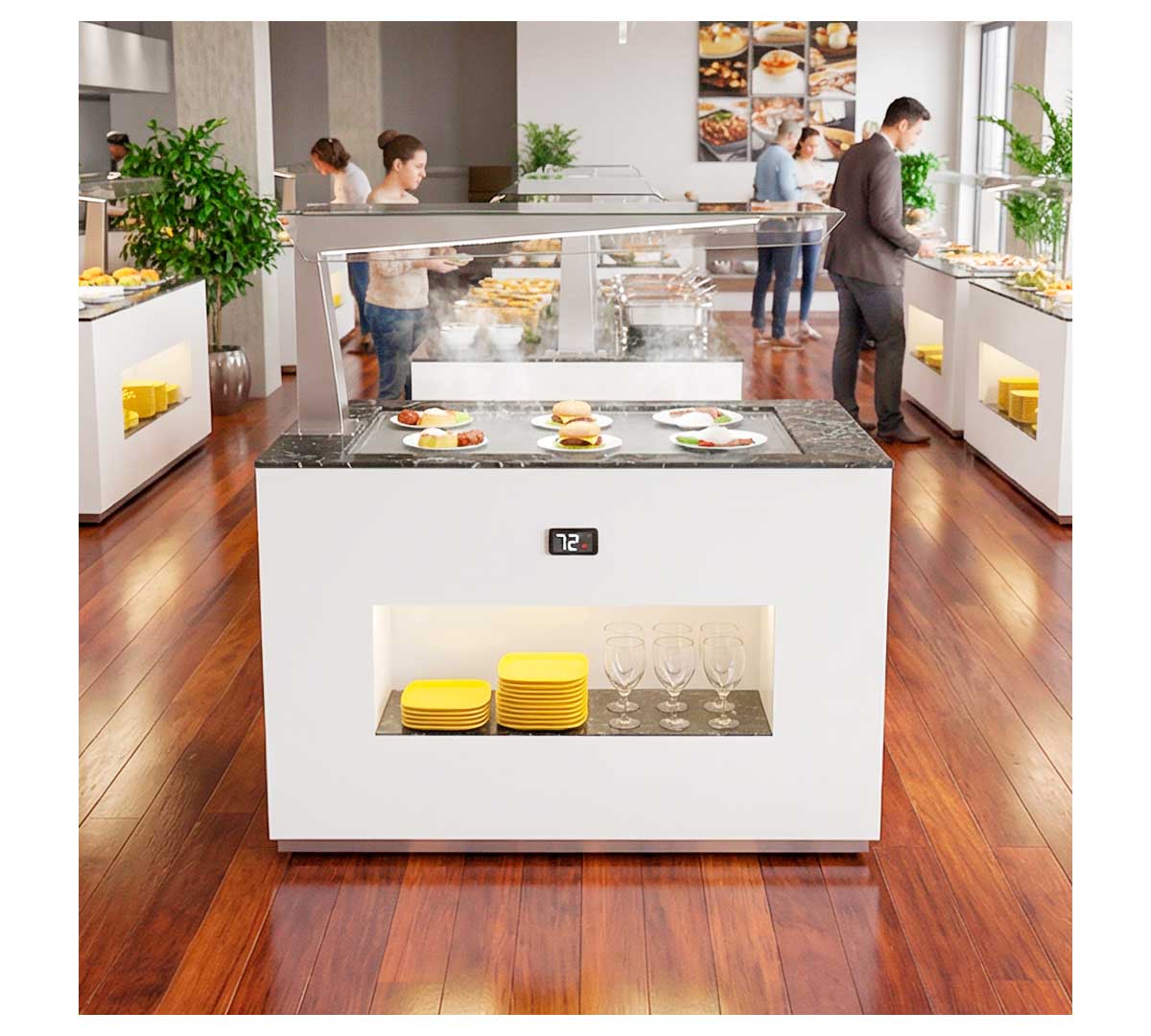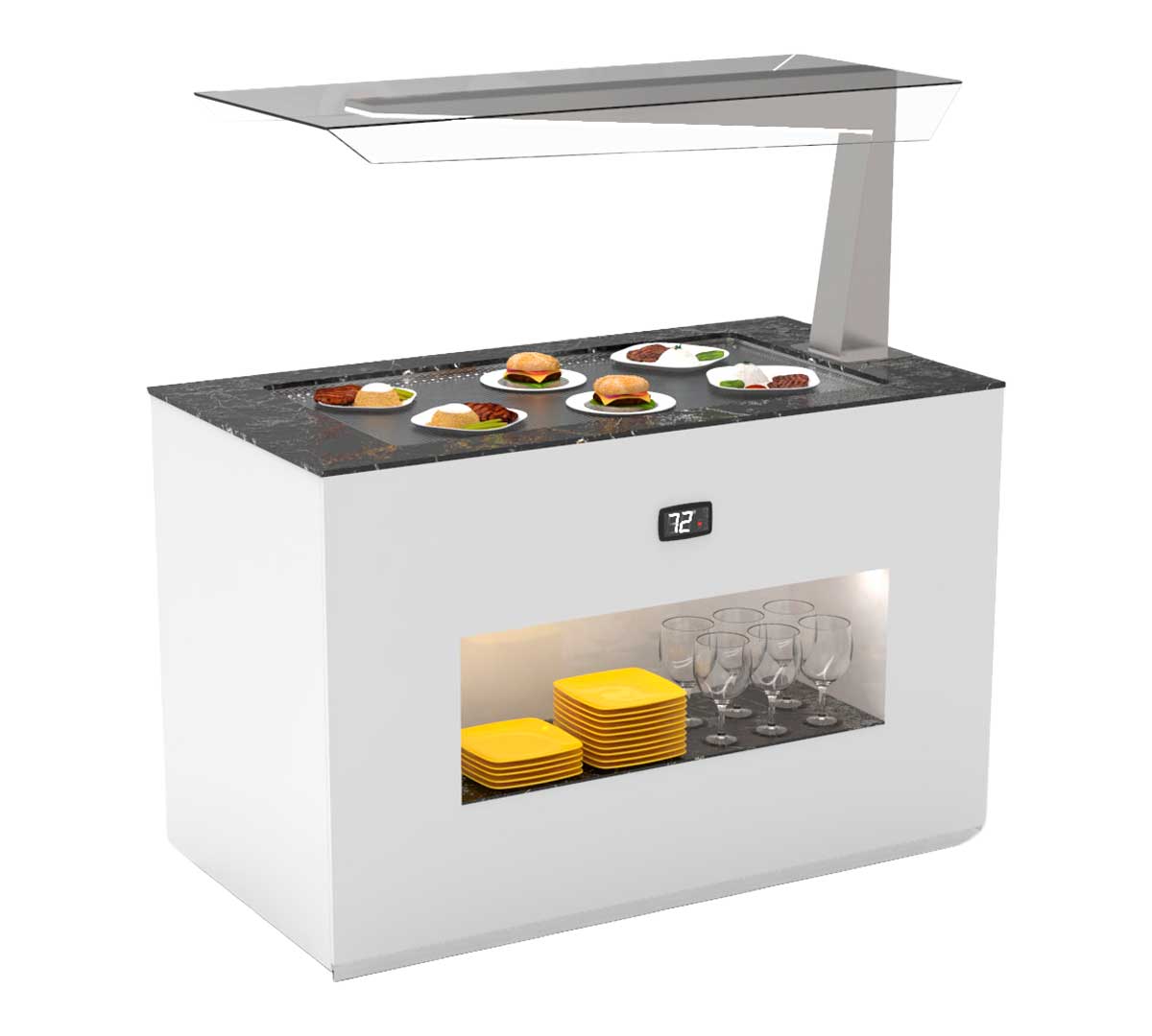 Módulo con placa caliente para autoservicio en buffets. Con antiesputo para iluminar y calentar de acero inoxidable, encimera con efecto piedra y espacio para platos iluminado. Es totalmente independiente e incluye ruedas. Permite combinarlo con otros módulos.