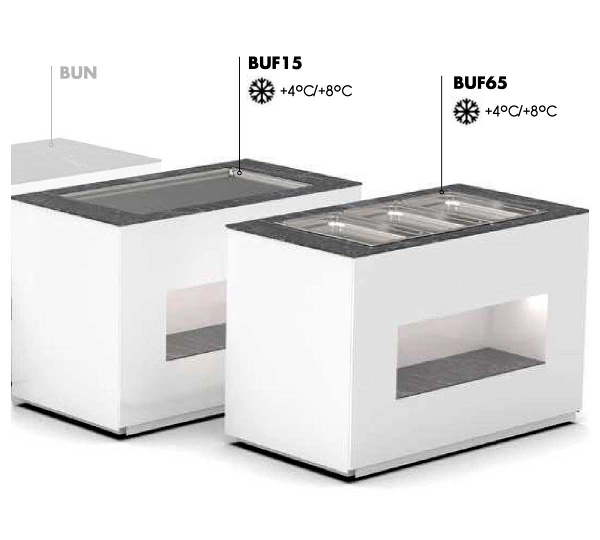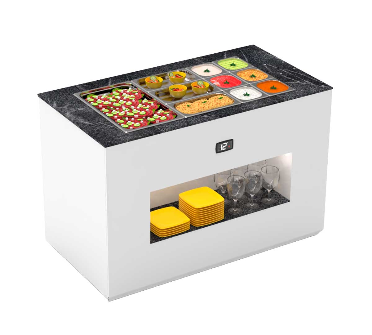 Módulo base refrigerado para buffets. La placa fría se suministra con bandejas gastronorm. Encimera con efecto piedra y espacio para platos iluminado. Totalmente independiente. Incluye ruedas. Permite combinarlo con otros módulos. Incluye 3 bandejas GN 1/1 con una profundidad de 6,5 cm.