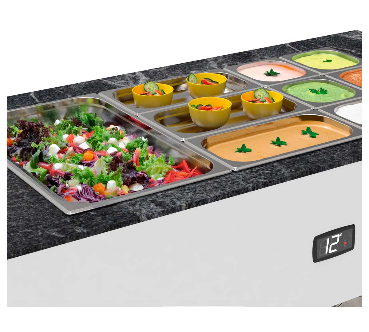 Este módulo es especialmente adecuado para la presentación de platos fríos en buffets de hoteles, restaurantes, cafeterías, eventos y servicios de catering, permitiendo mantener la cadena de frío en todo momento y facilitando el autoservicio de los comensales.