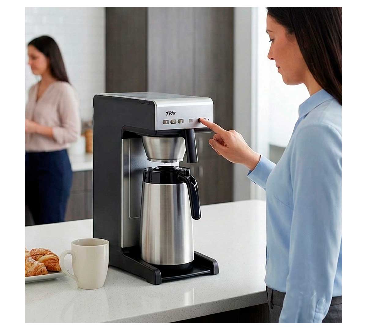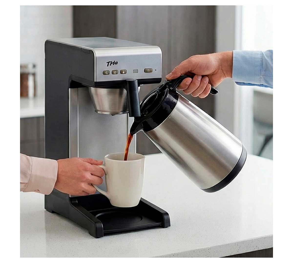 La Cafetera TH de Bravilor está equipada con porta-filtro de acero inoxidable. Este producto tiene dos modelos disponibles, con o sin conexión al agua corriente.