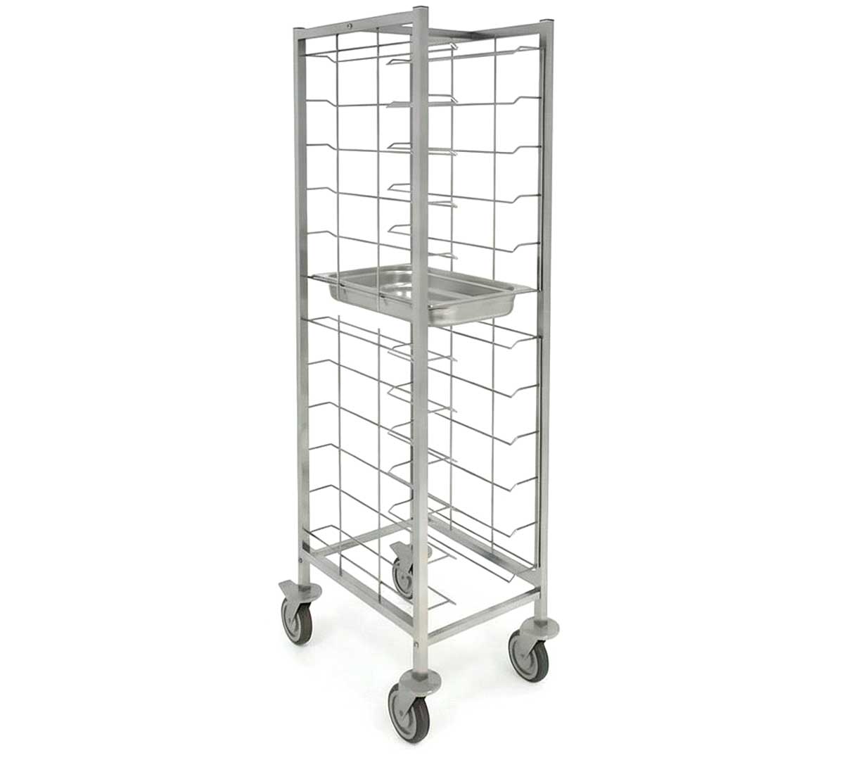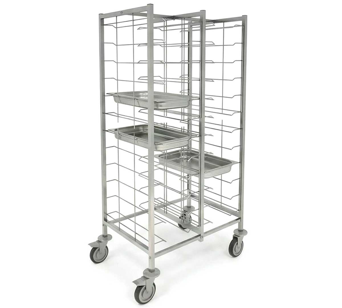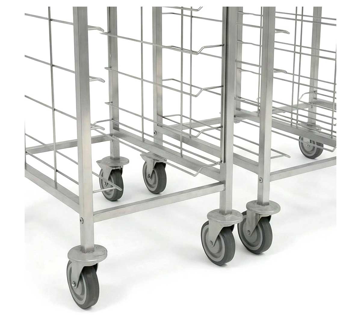 Carro porta bandejas abierto con capacidad para 12 o 24 bandejas, según el modelo. Permite una carga máxima de 5 kg por nivel. Su estructura es robusta y está totalmente soldada. Es apto para bandejas estándar con medidas mínimas de 45 x 35 cm o 48 x 37 cm y máximas de 53 x 37 cm; GN 1/1 y Fast Food de 35 x 27 cm.