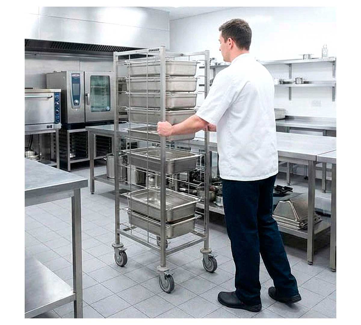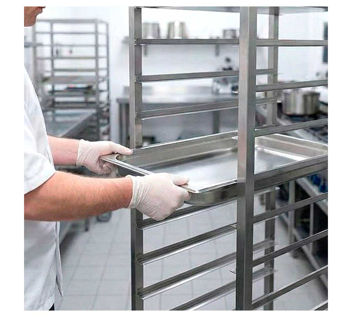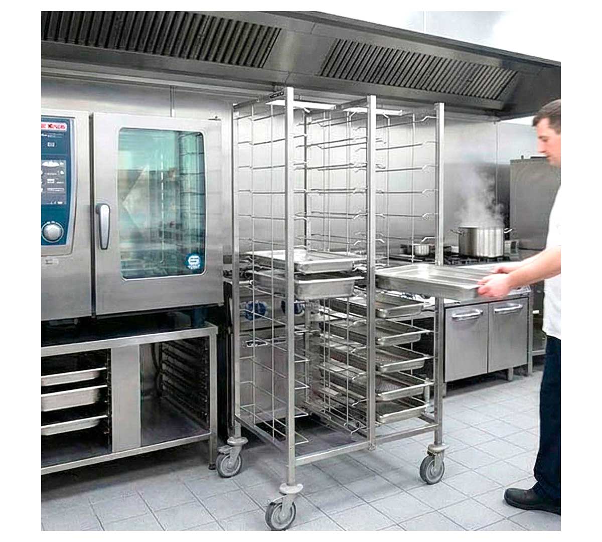 Carro porta bandejas abierto con capacidad para 12 o 24 bandejas, según el modelo. Permite una carga máxima de 5 kg por nivel. Su estructura es robusta y está totalmente soldada. Es apto para bandejas estándar con medidas mínimas de 45 x 35 cm o 48 x 37 cm y máximas de 53 x 37 cm; GN 1/1 y Fast Food de 35 x 27 cm.