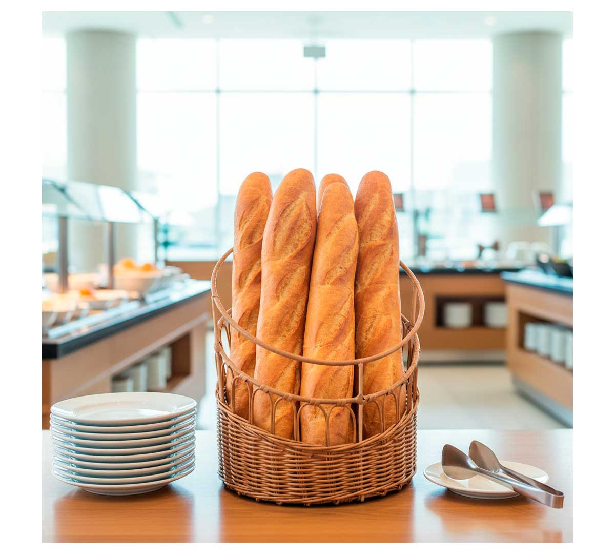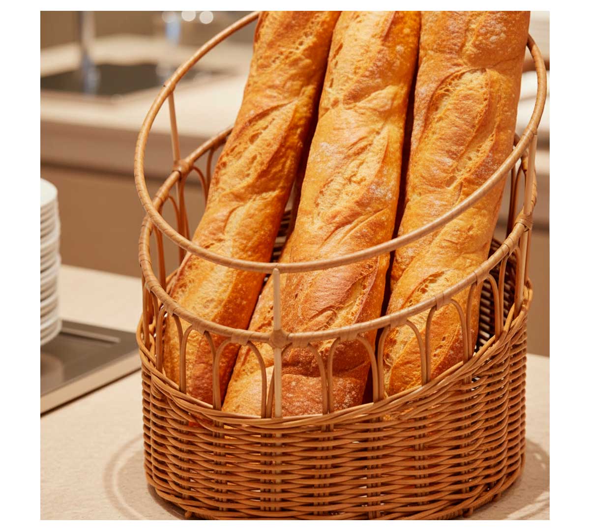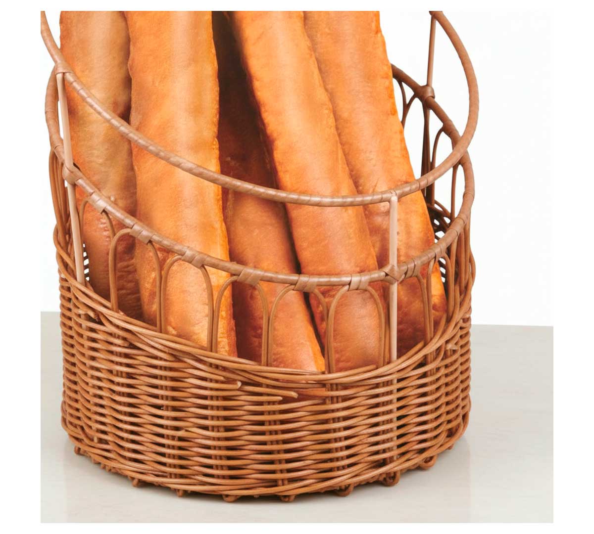 Cesta de presentación redonda para el pan tipo baguette. Está fabricada en polipropileno con imitación de fibra natural. La parte frontal es más baja para exponer los productos con mayor visibilidad y facilitar el acceso. Es ideal para catering y buffet.