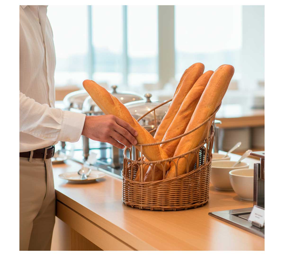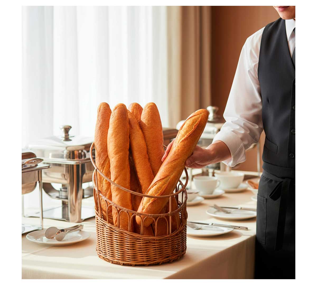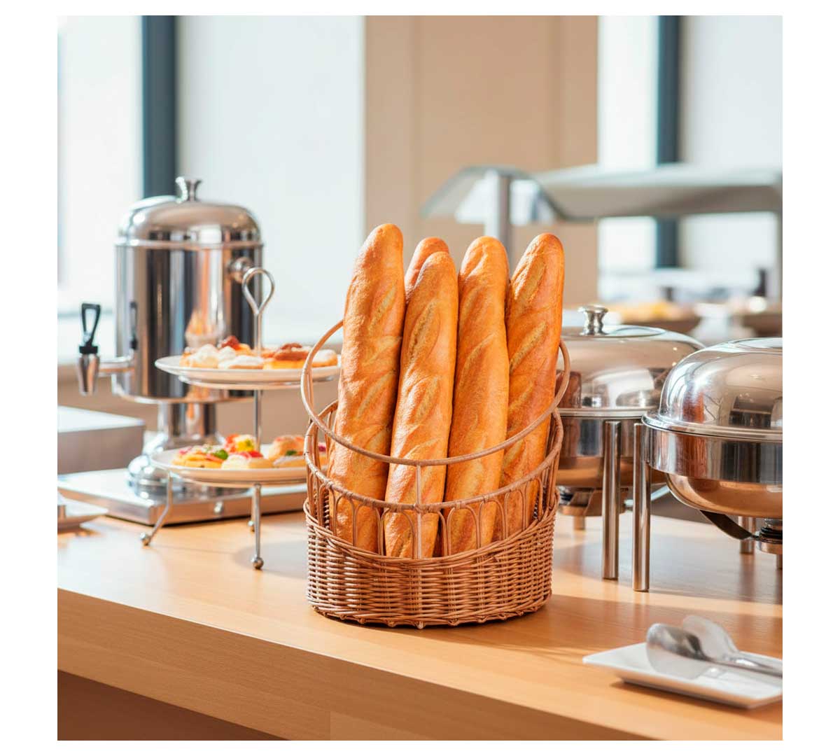 Cesta de presentación redonda para el pan tipo baguette. Está fabricada en polipropileno con imitación de fibra natural. La parte frontal es más baja para exponer los productos con mayor visibilidad y facilitar el acceso. Es ideal para catering y buffet.