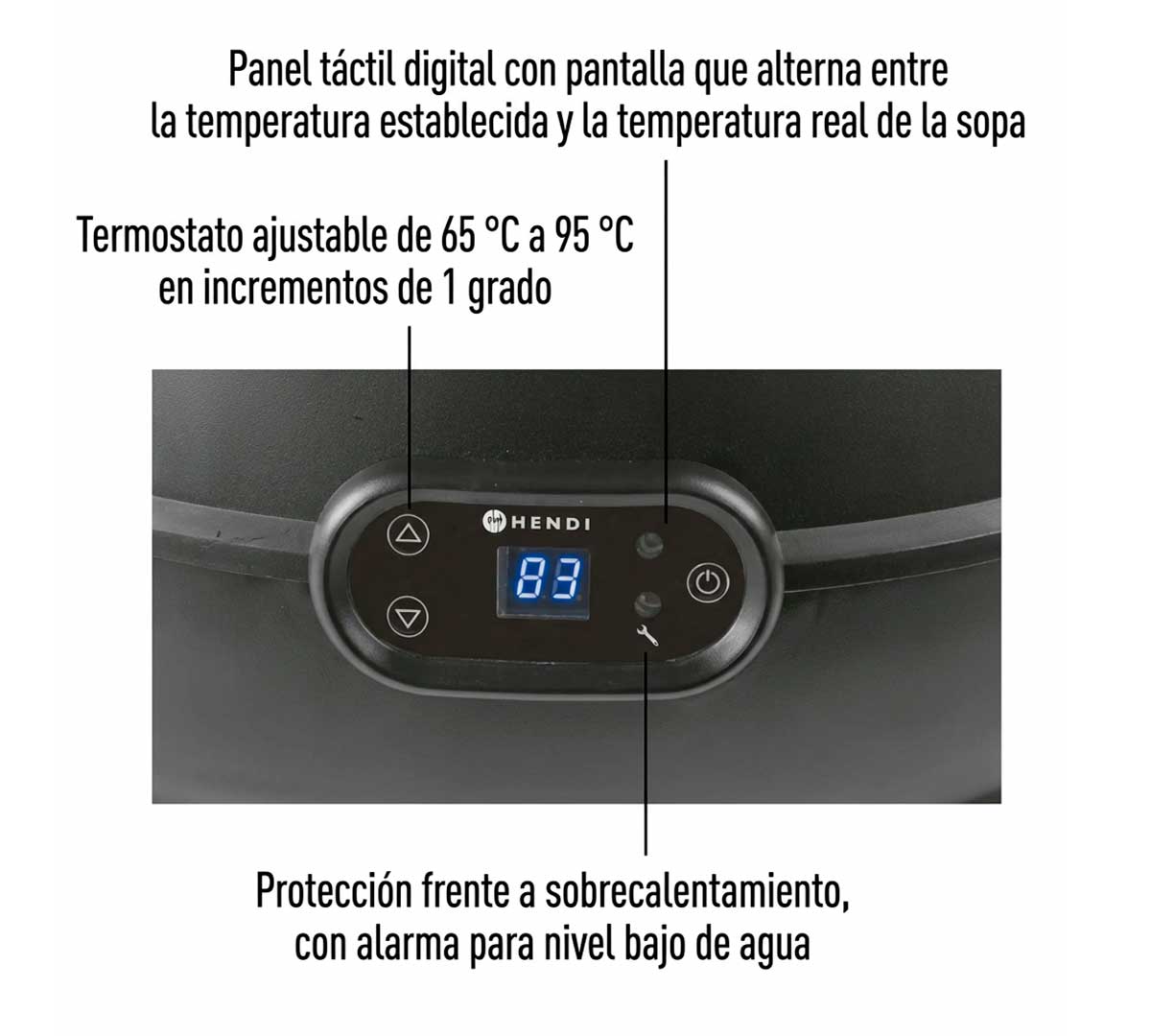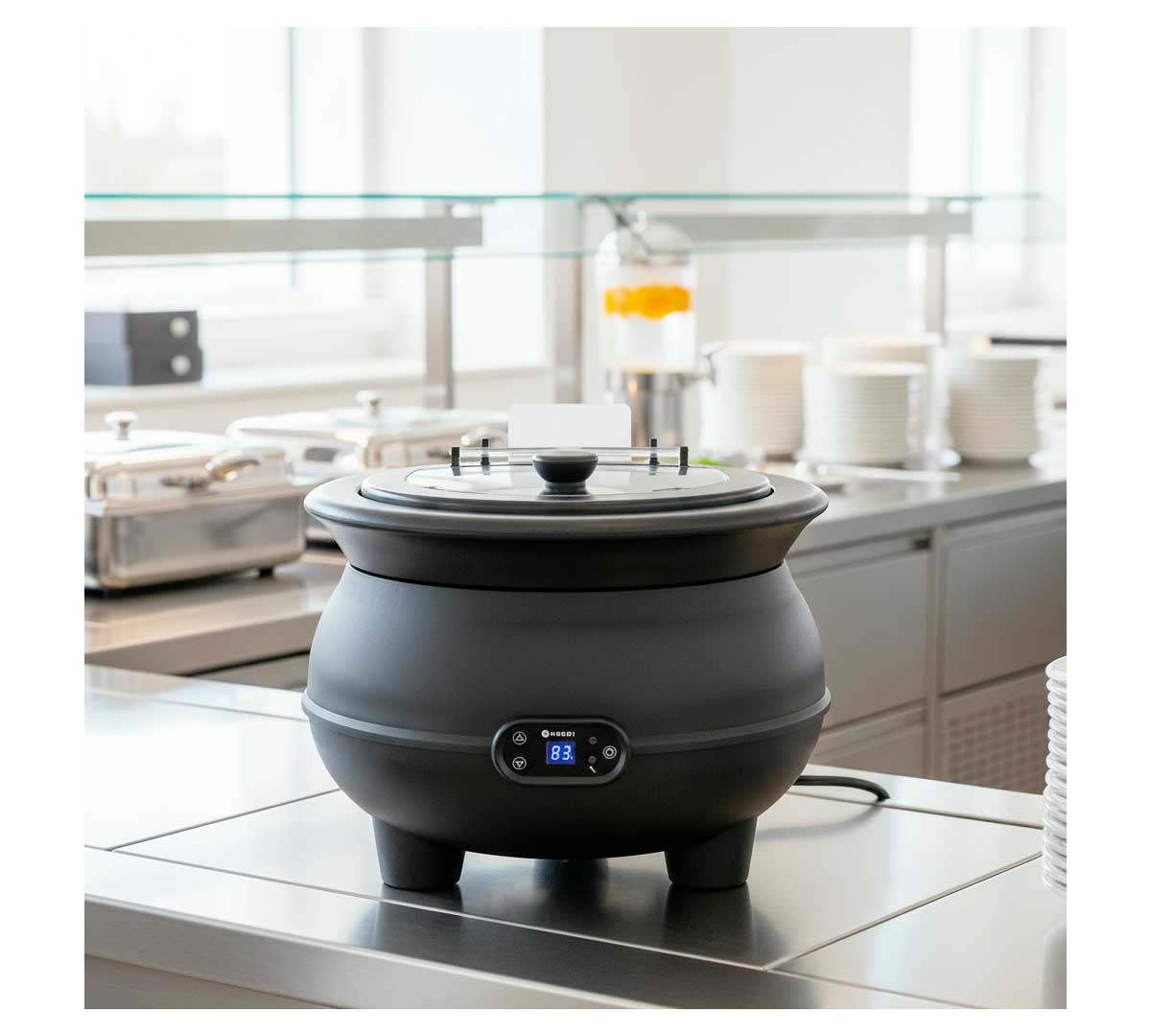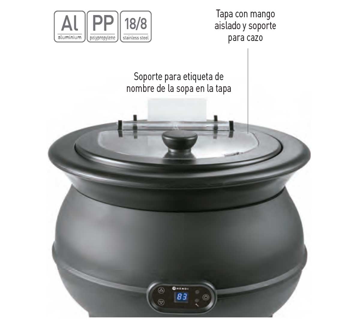 Sopera eléctrica diseñada para buffet o servicio de mesa. Tiene tapa extraible de policarbonato, panel tácil y soporte para etiqueta identificativa. Permite ajustar la temperatura de 65 °C y 95 °C. Con protección frente a sobrecalentamiento. Incluye recipiente de acero inoxidable.