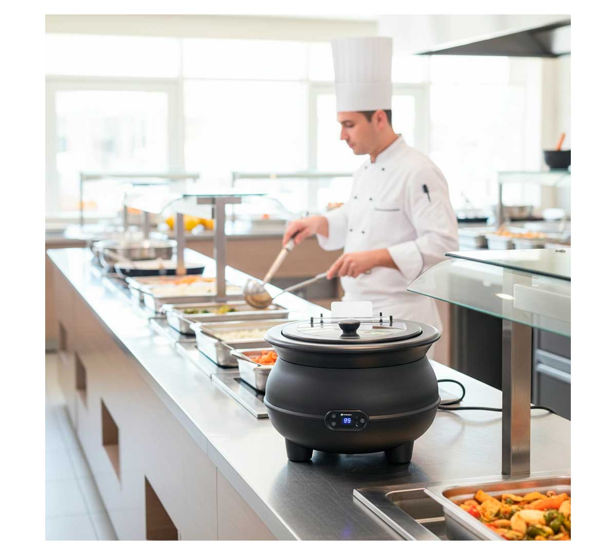 Este hervidor de sopa eléctrica está especialmente indicado para buffets, comedores de autoservicio, eventos y cualquier entorno donde se requiera mantener sopas, cremas o caldos a la temperatura óptima durante largos periodos, garantizando tanto la seguridad alimentaria como el confort del servicio.