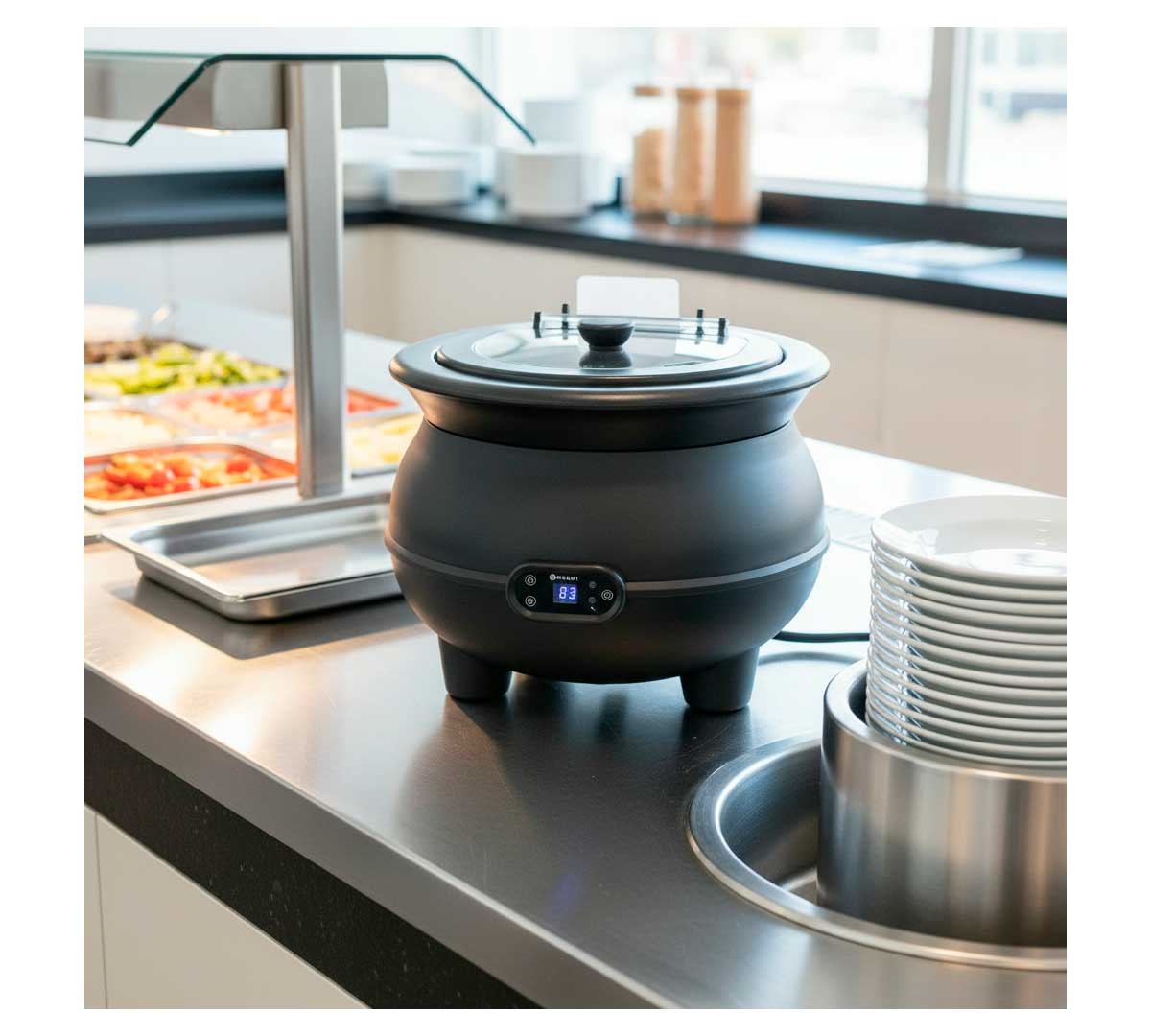 La Sopera Eléctrica de Hendi es una solución eficiente y moderna para mantener sopas y cremas calientes en servicio, perfecta para líneas de buffet y autoservicio.