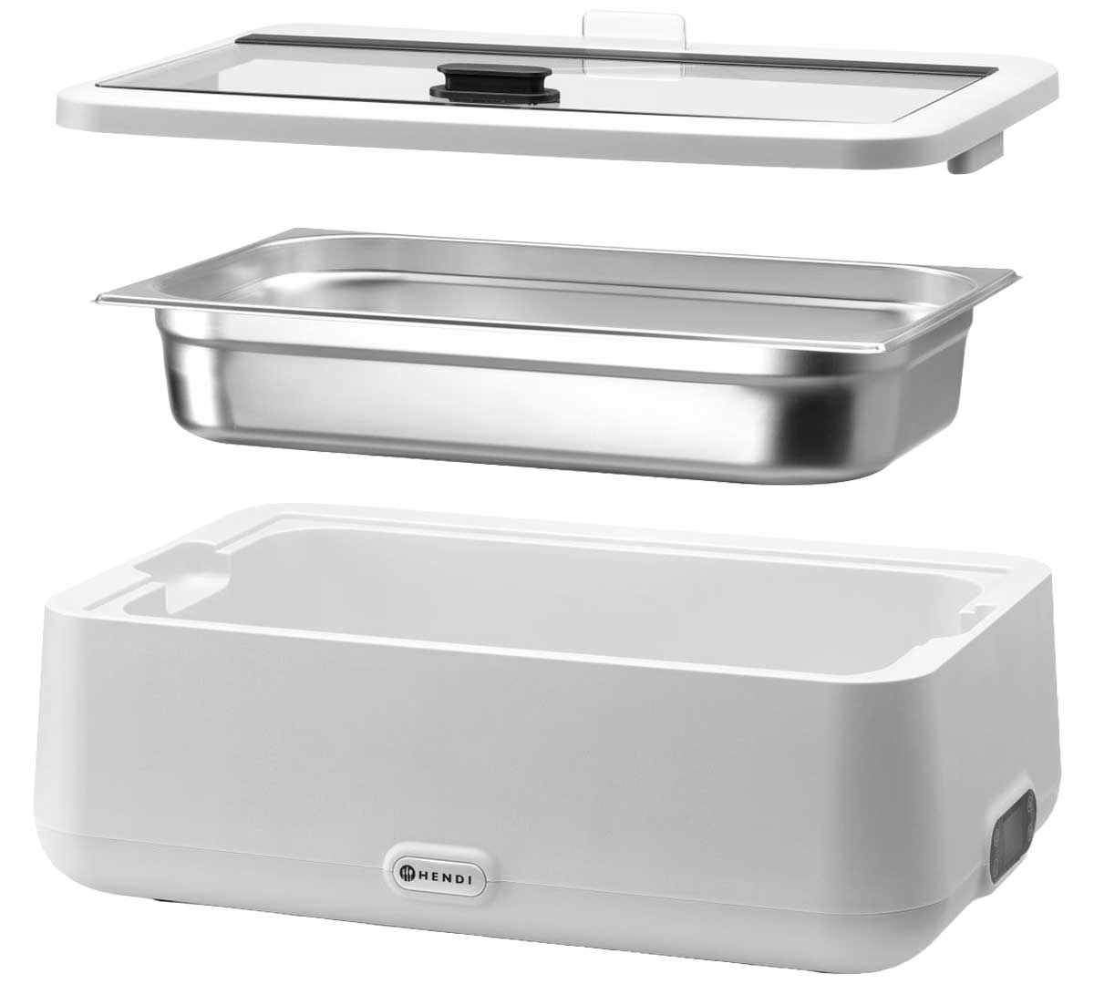 Chafing dish diseñado para mantener platos calientes en buffets y servicios de catering. Con un diseño moderno y funcional, cuerpo de polipropileno y control digital de temperatura ajustable entre 35 °C y 85 °C. La tapa es de vidrio templado. La pantalla muestra el tiempo y la temperatura y conserva el último ajuste programado. Incluye recipiente GN 1/1 de acero inoxidable con profundidad 10 cm.