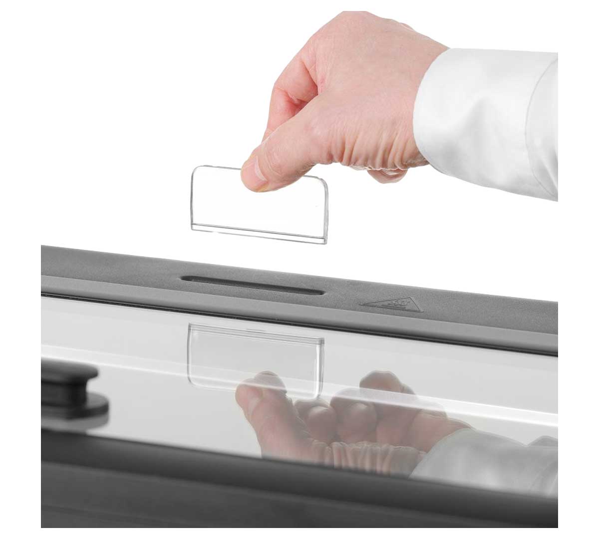 La tapa de vidrio templado tiene un diseño de doble parte con bisagra de aluminio que reduce la pérdida de calor al abrirse y mantiene condiciones higiénicas óptimas, mejorando la conservación del alimento caliente.