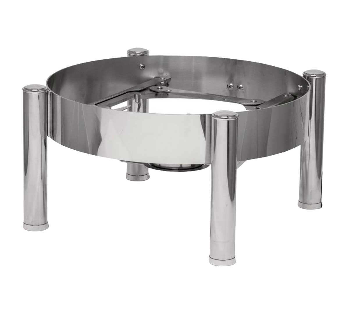 El Stand Chafing Dish Redondo Pujadas está diseñado como estructura base para sistemas de buffet, permitiendo trabajar tanto con combustible tradicional como con placas de inducción modernas.