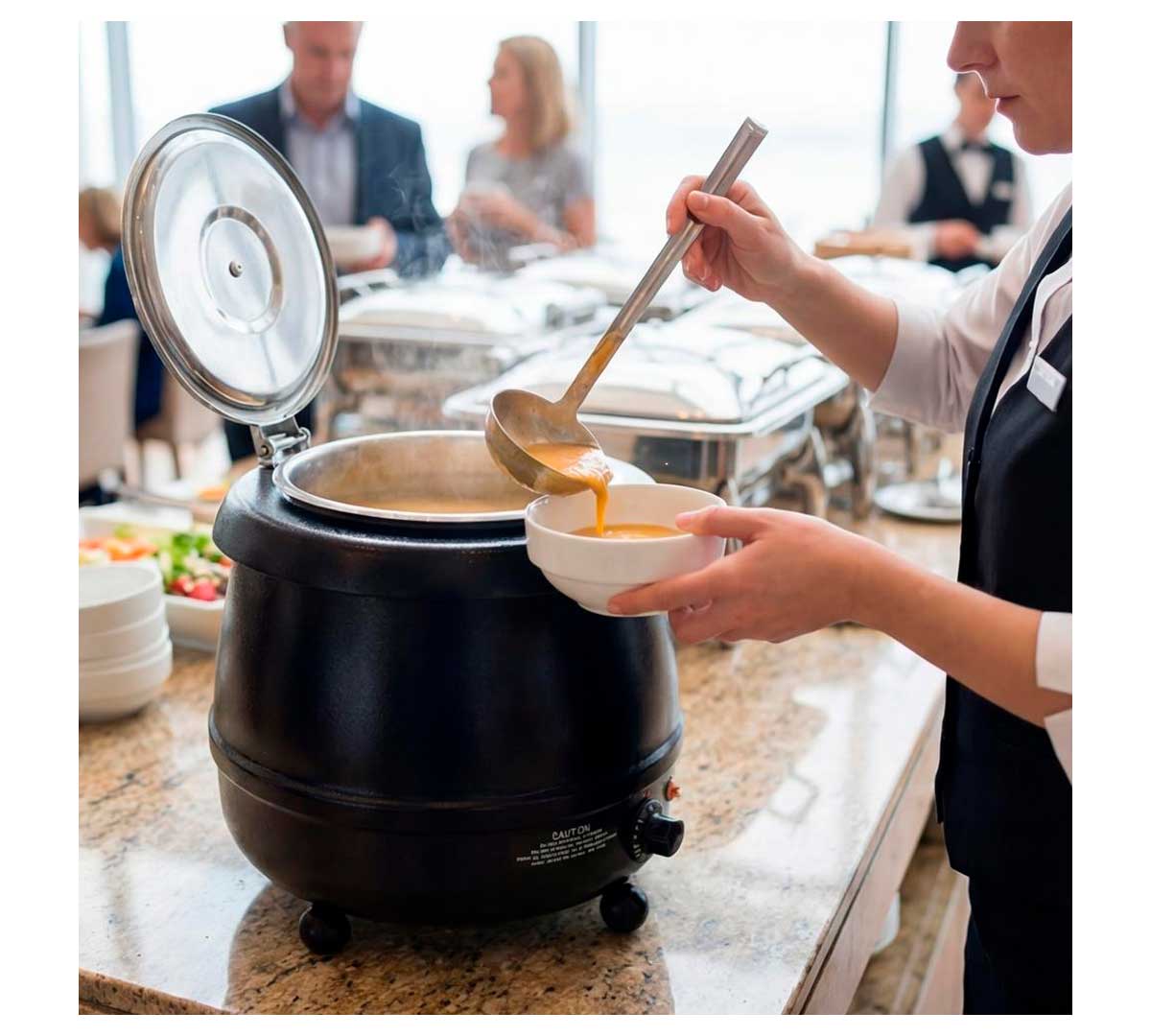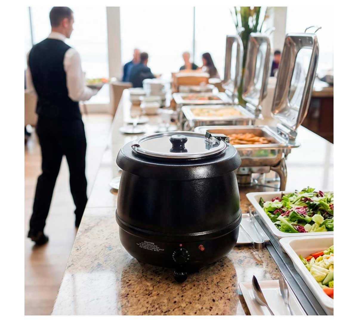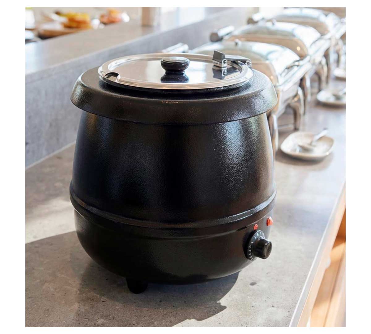 Olla sopera eléctrica para buffet. El cuerpo es de aluminio con baño epoxy de color negro. Incluye una cuba de 10 litros de acero inoxidable. Está recomendada para servir sopas, salsas, estofados, etc.
