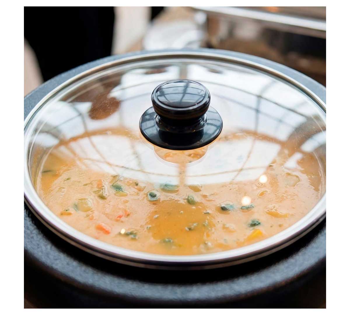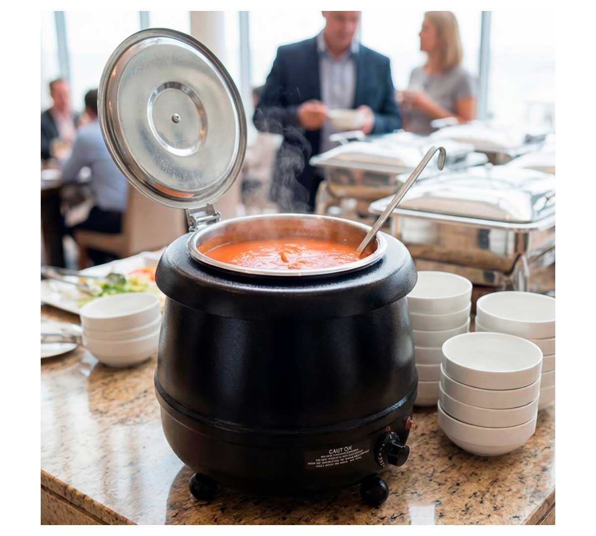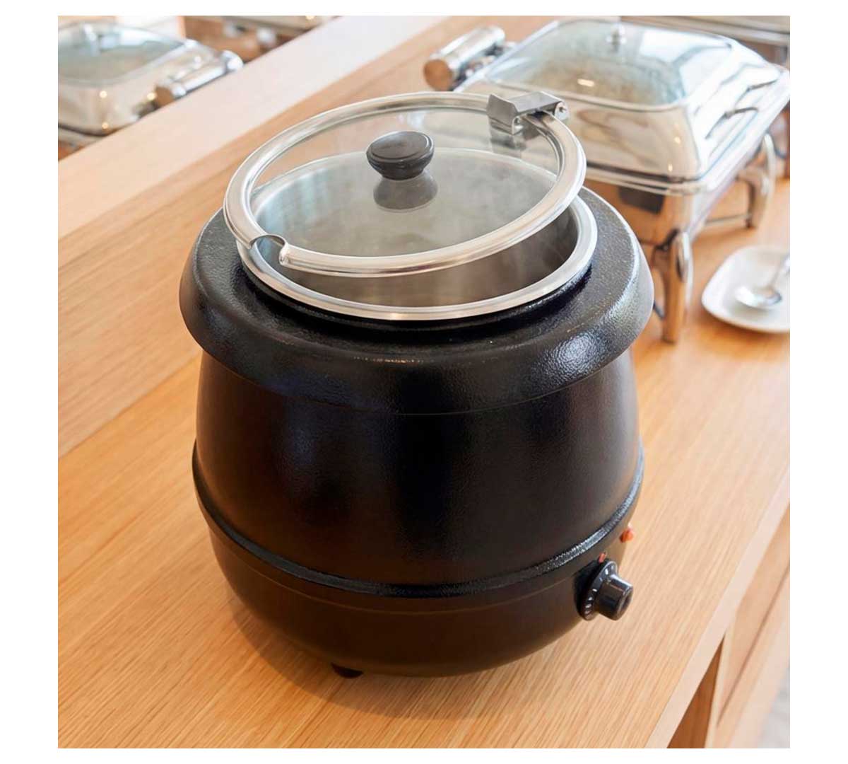 Olla sopera eléctrica para buffet. El cuerpo es de aluminio con baño epoxy de color negro. Incluye una cuba de 10 litros de acero inoxidable. Está recomendada para servir sopas, salsas, estofados, etc.