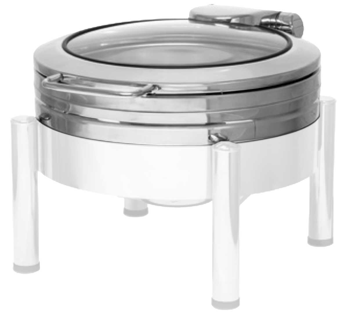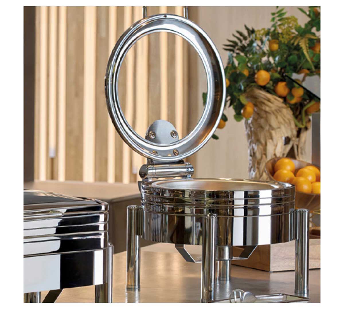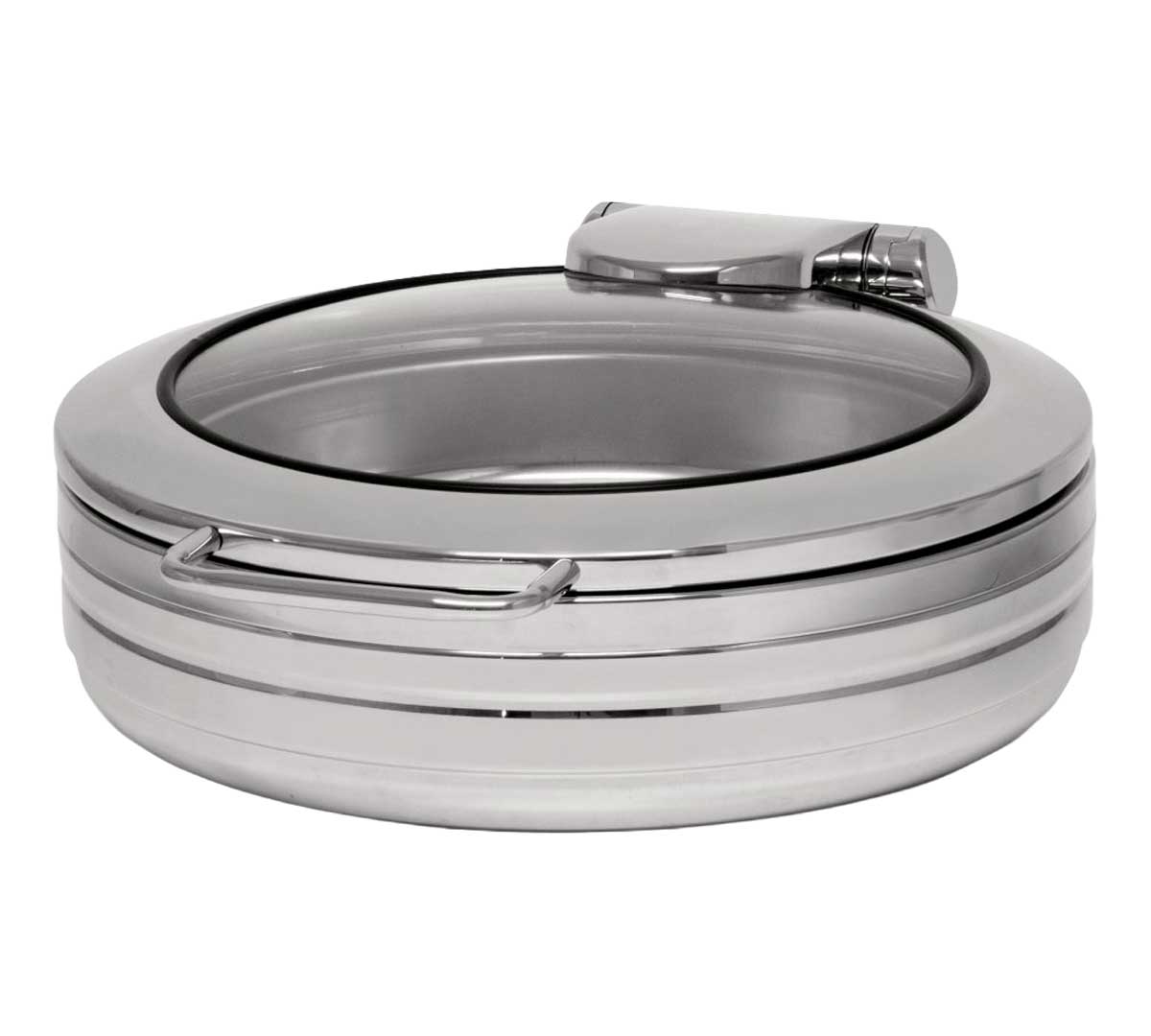 Recipiente chafing dish redondo de 6 litros con tapa de cristal y base difusora apta para inducción, diseñado para buffets profesionales que requieren mantenimiento térmico uniforme y presentación elegante en sistema modular.