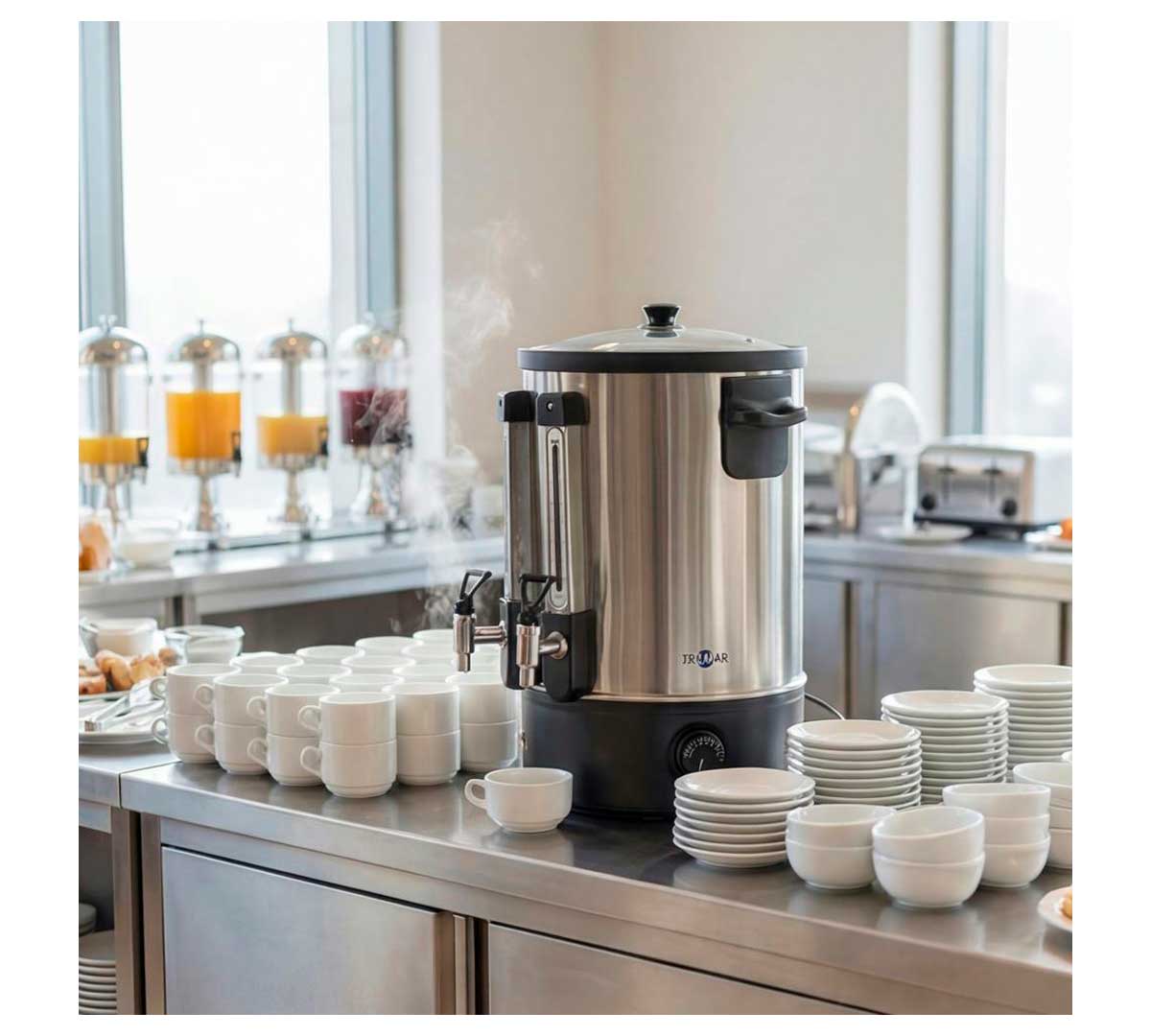Termo calentador de leche, caldo, té y agua, ideal para el servicio de desayunos buffet. Calienta a baño maría, temperatura regulable. Con dos grifos, tambor en acero inox. Dispone de grifo con nivel y tiene una potencia de 2 kW.