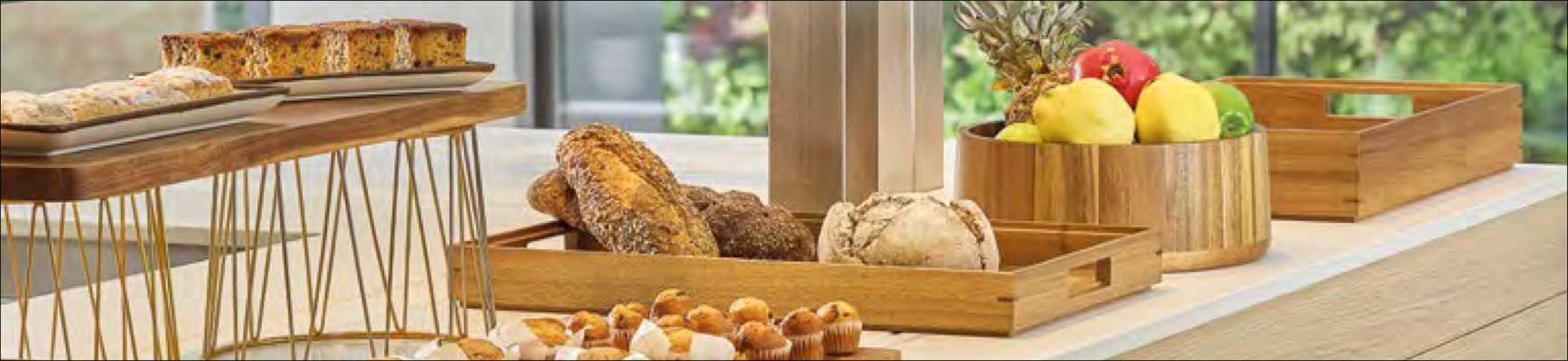 La Colección Nova de Pujadas incluye bandejas y otros artículos para servicios de buffet y catering fabricados en madera.