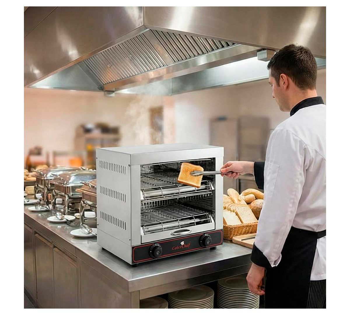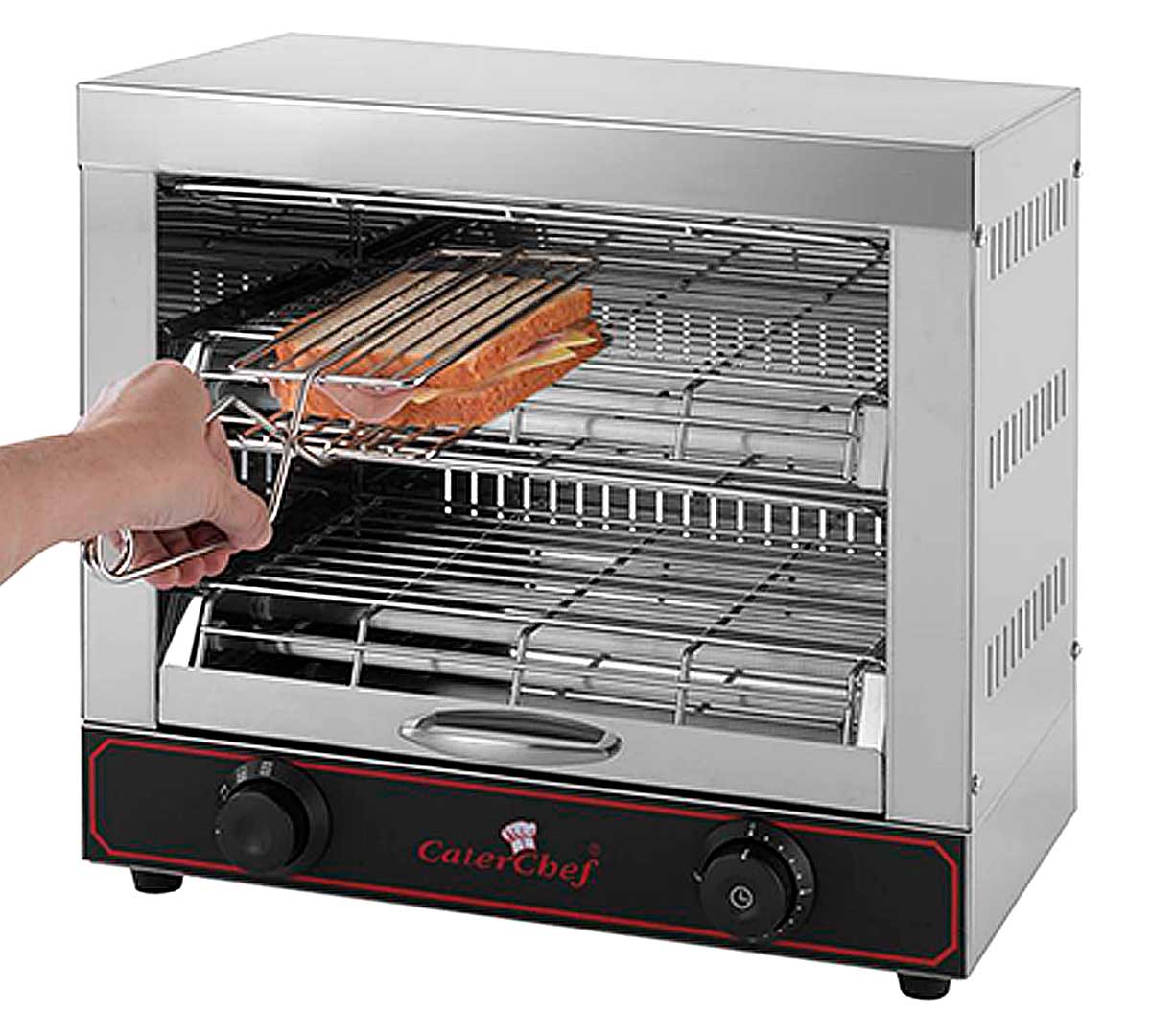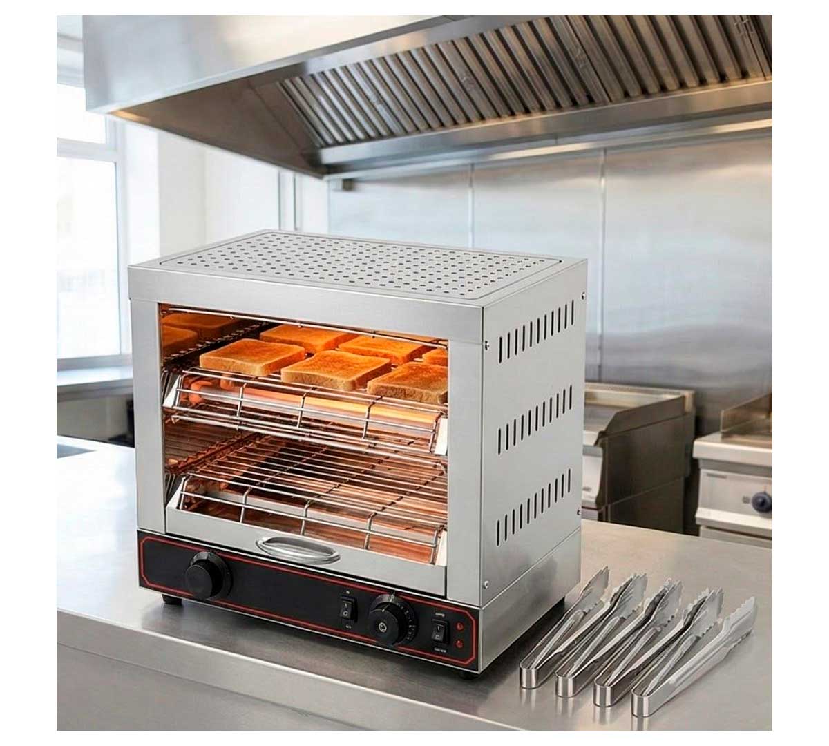 Tostadora con dos niveles diseñada para trabajar en cualquier buffet o negocio de manera continua ofreciendo el mayor rendimiento y menor consumo eléctrico. Las resistencias funcionan por separado. Tiene temporizador. Incluye 6 pinzas para sandwich.