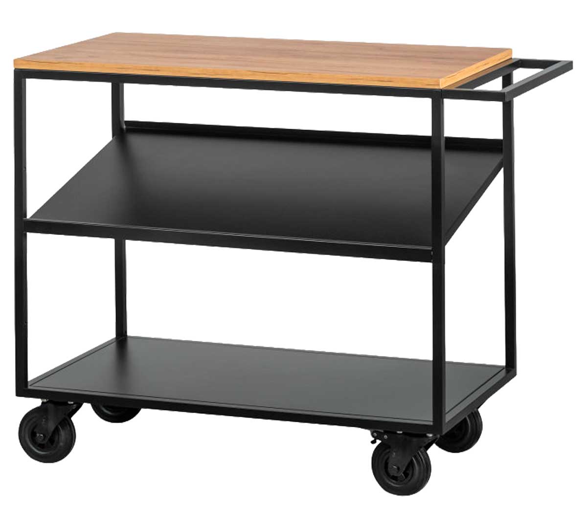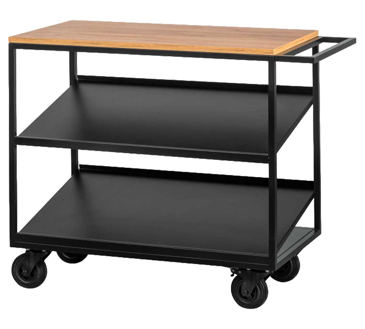 • Tipo de carro Carro de servicio de tres niveles con encimera de madera y estante central inclinado.
