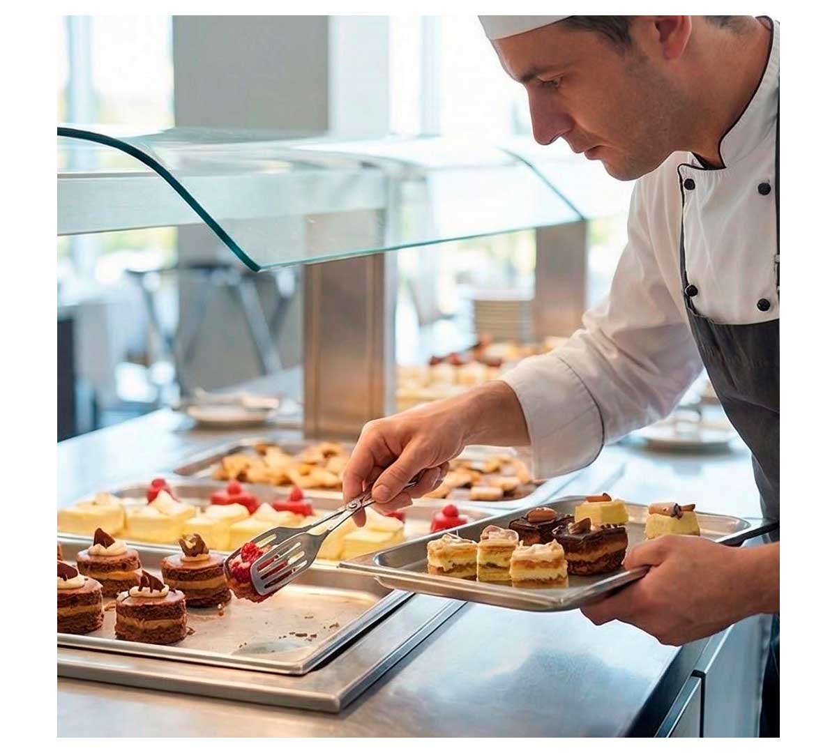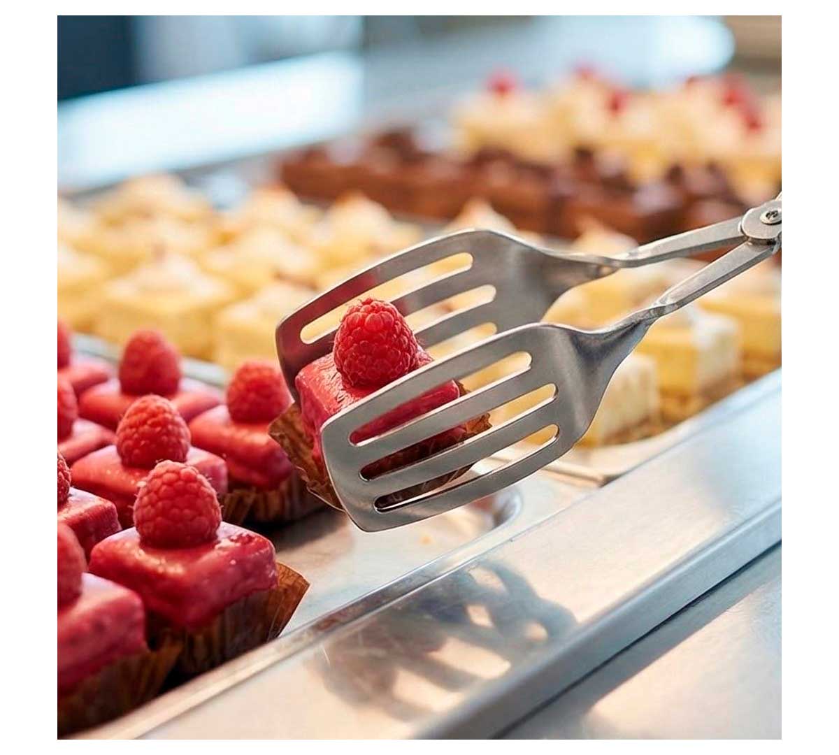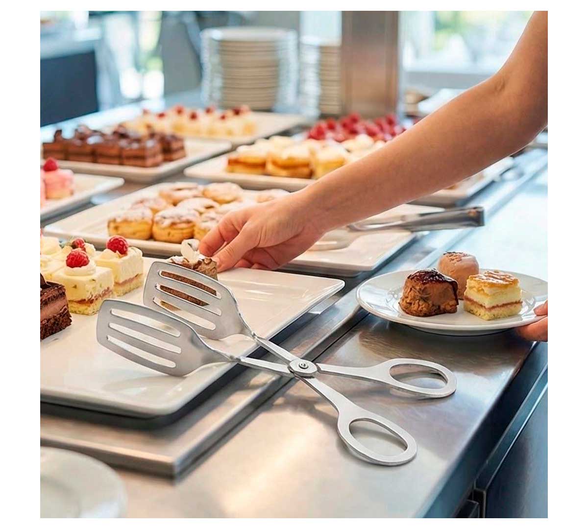 Pinza diseñada para servir dulces como pasteles, etc. Con forma de tijera. Ideal para buffets. Está fabricada en acero inoxidable. Se vende en pack de 10 unidades.