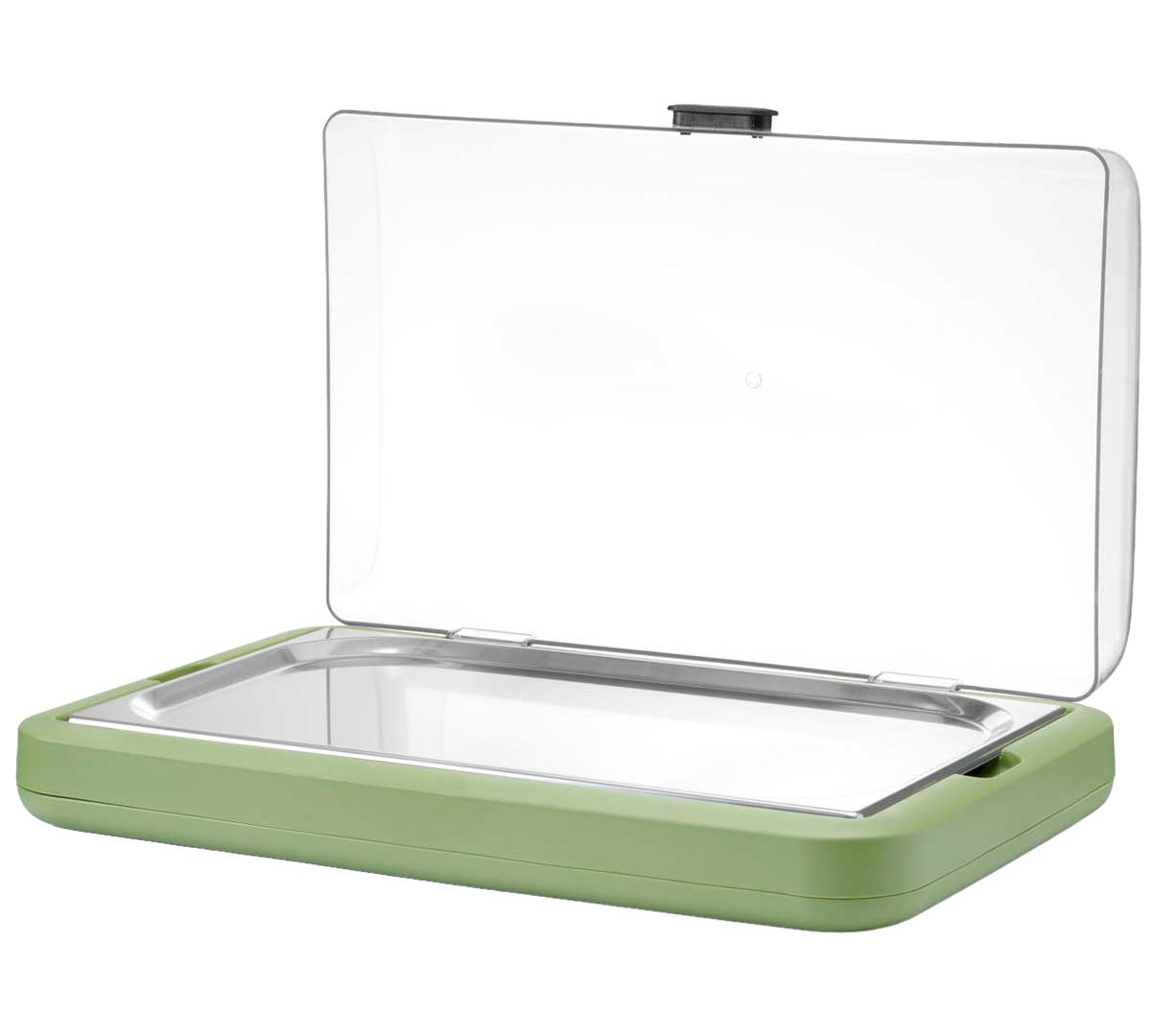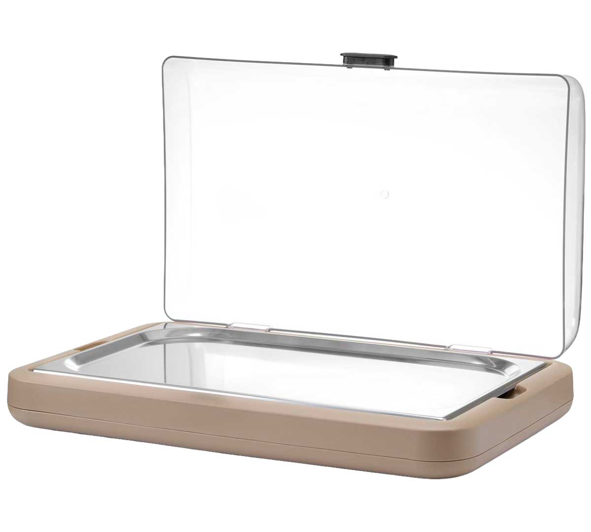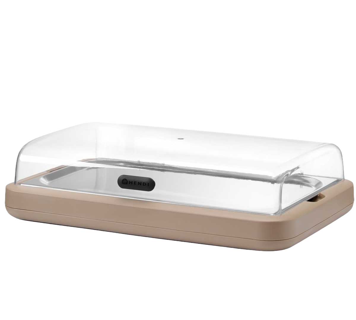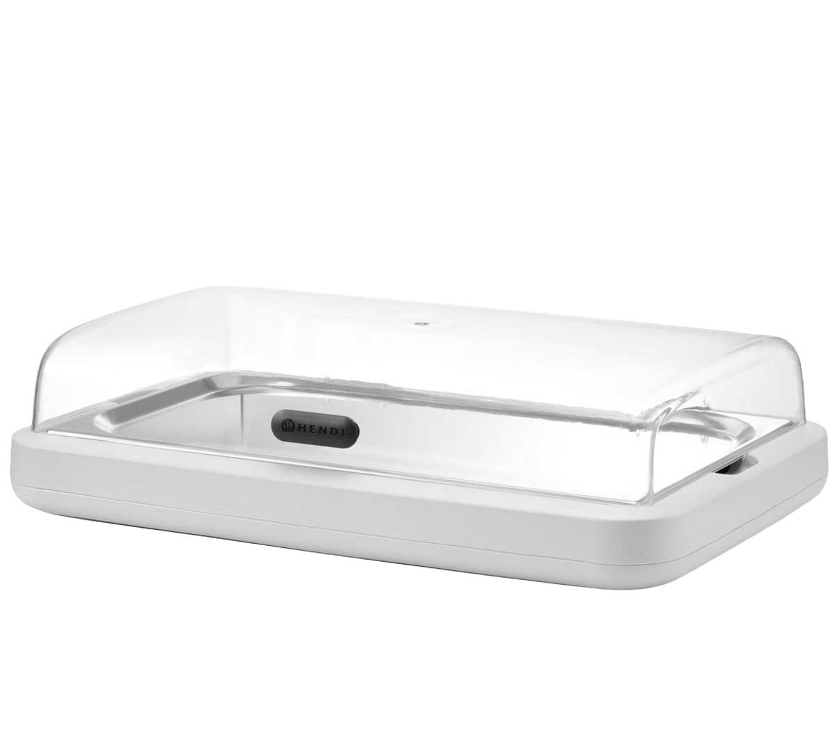 Expositor para buffet diseñado para presentar alimentos fríos de forma atractiva y funcional. Diseño moderno y sólido que facilita su uso en servicios de autoservicio. Tiene tapa transparente de ABS que se abre hasta 90º. Carcasa de polipropileno. Incluye bandeja GN 1/1 y placa refrigerante rellena de gel.