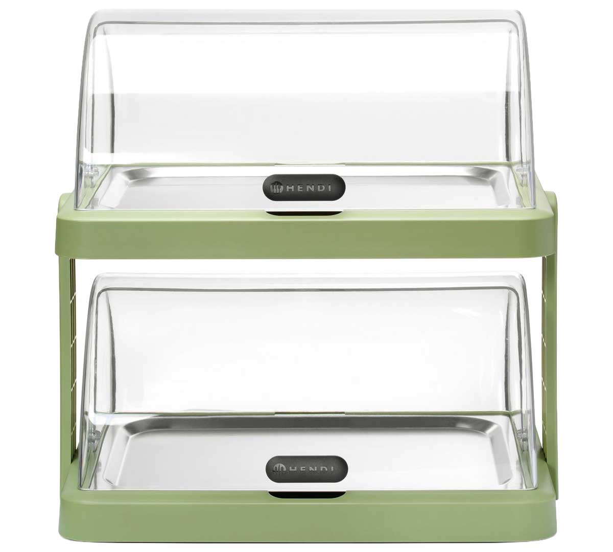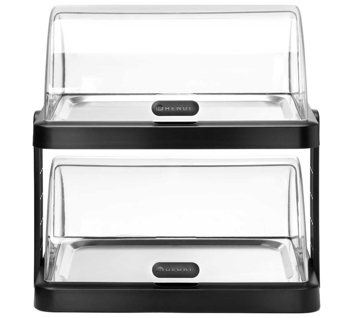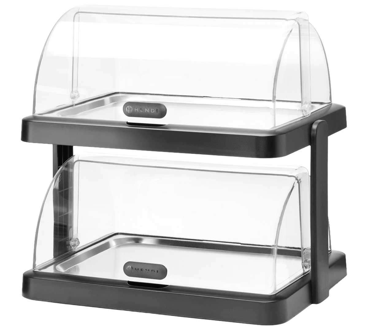 El Expositor con Placa Refrigerante y Tapa Enrollable Uniq Duo de Hendi es una solución elegante y funcional para la exposición y conservación de alimentos fríos en líneas de buffet, catering y restauración. Tiene 2 pisos.