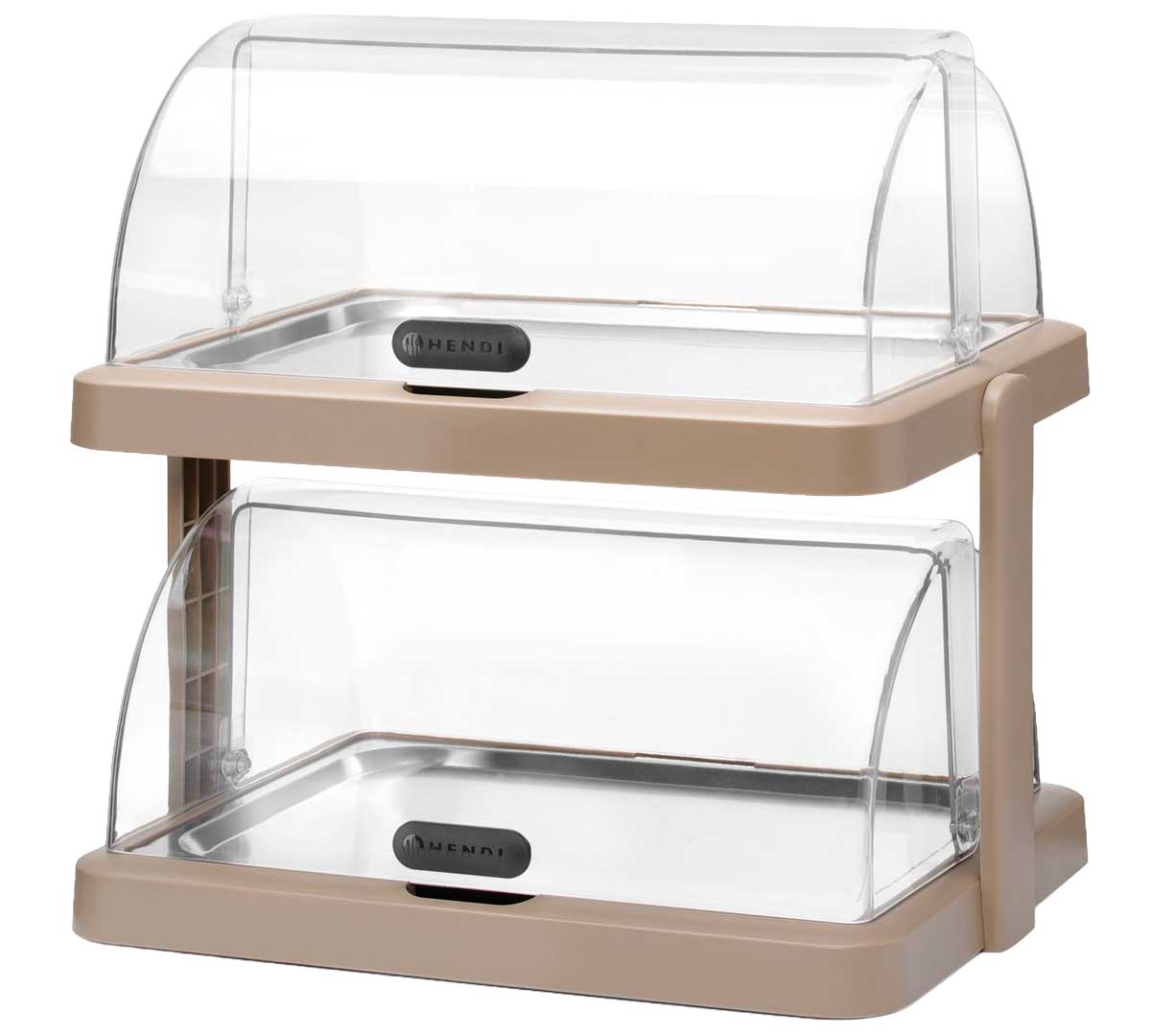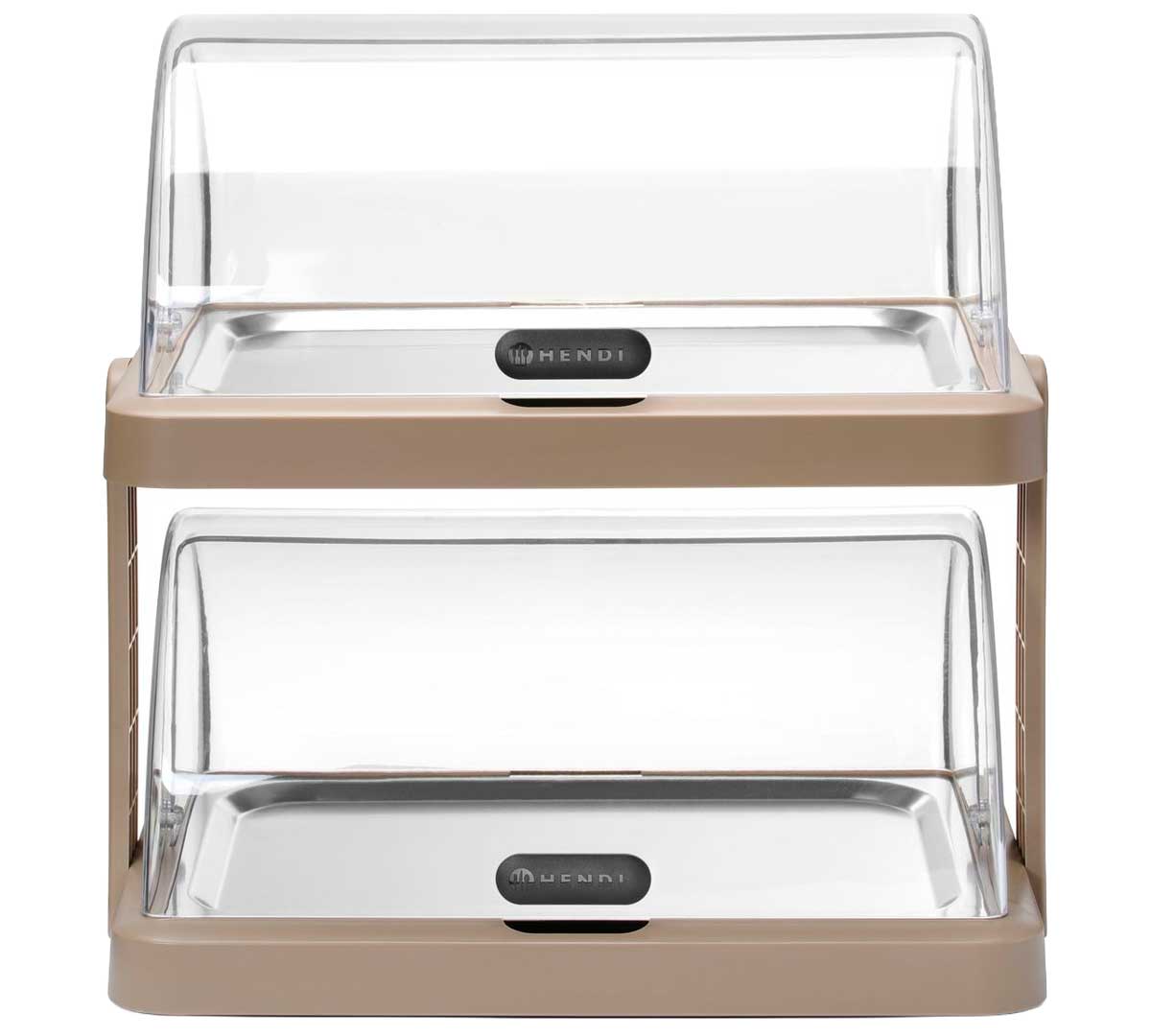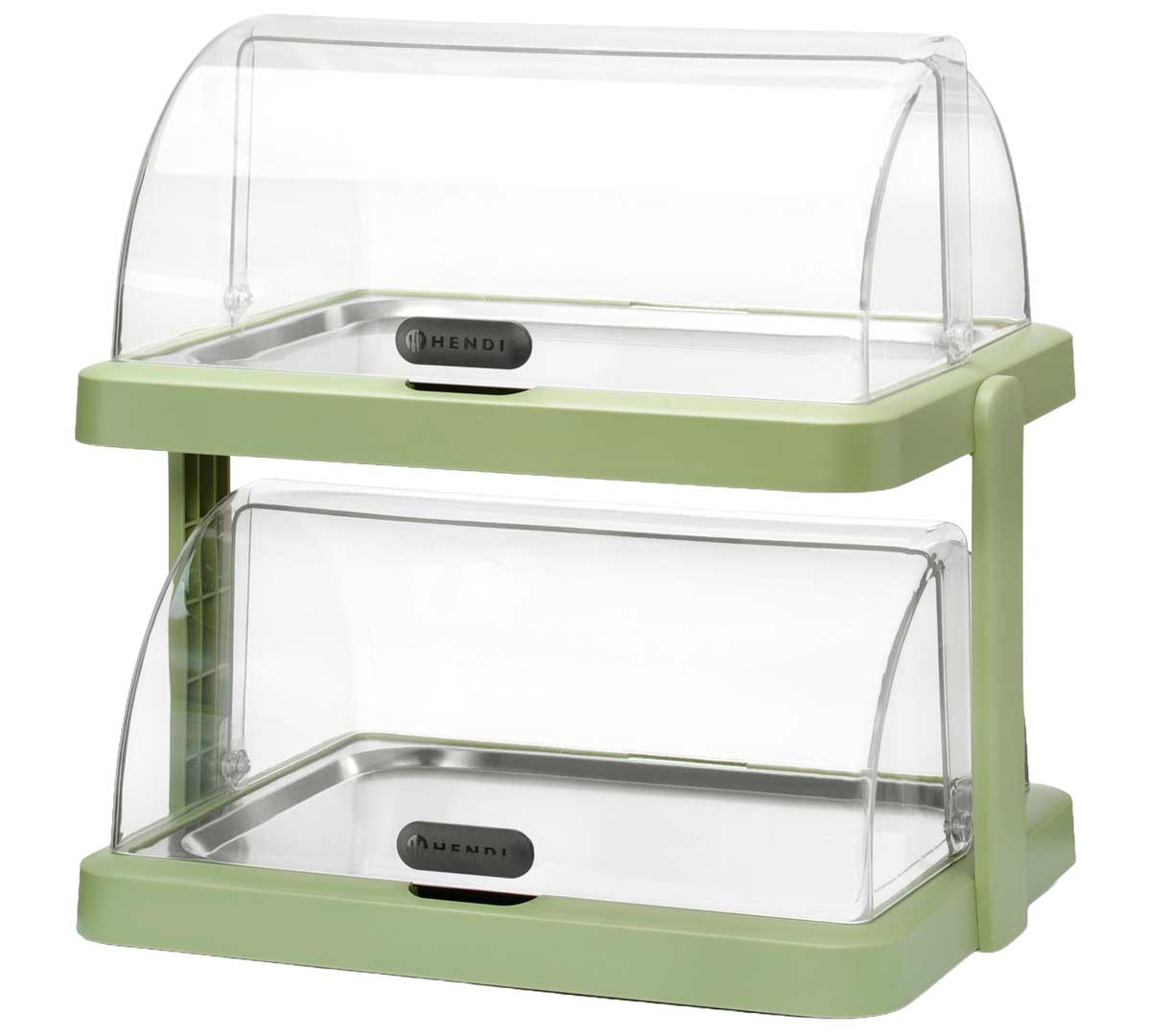 El Expositor con Placa Refrigerante y Tapa Enrollable Uniq Duo de Hendi es una solución elegante y funcional para la exposición y conservación de alimentos fríos en líneas de buffet, catering y restauración. Tiene 2 pisos.