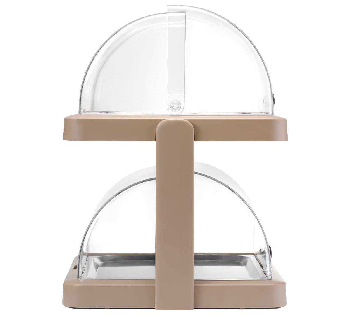 Expositor para buffet de 2 pisos diseñado para presentar alimentos fríos de forma atractiva y funcional, con un diseño moderno. Tiene las tapas transparentes de ABS enrollables que se abren hasta 90º y la carcasa es de polipropileno. Incluye 2 bandejas de acero inoxidable con medidas 40 x 30 cm y 4 placas refrigerantes planas.