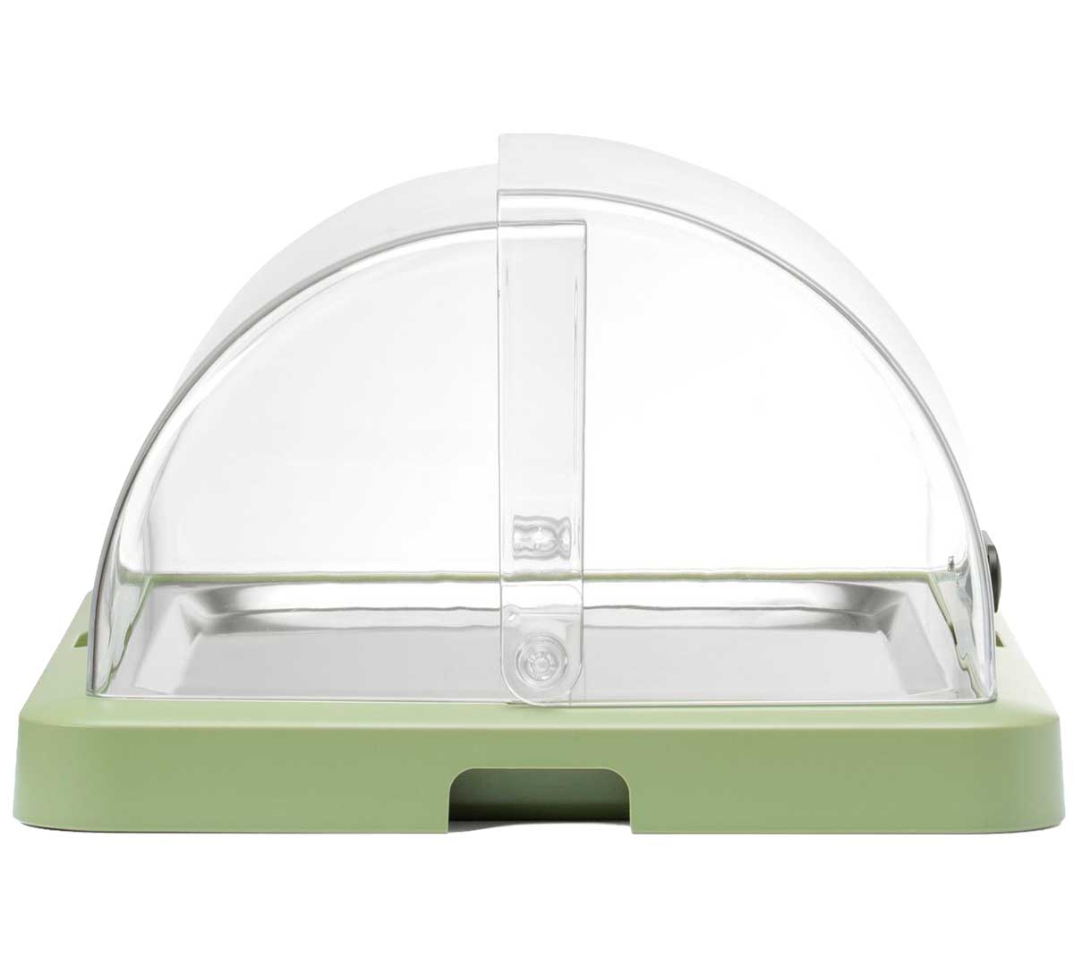 La tapa enrollable se abre hasta 90 grados, con un asa práctica para facilitar su manejo sin tocar directamente los alimentos, permitiendo elegir sin levantar completamente la tapa.