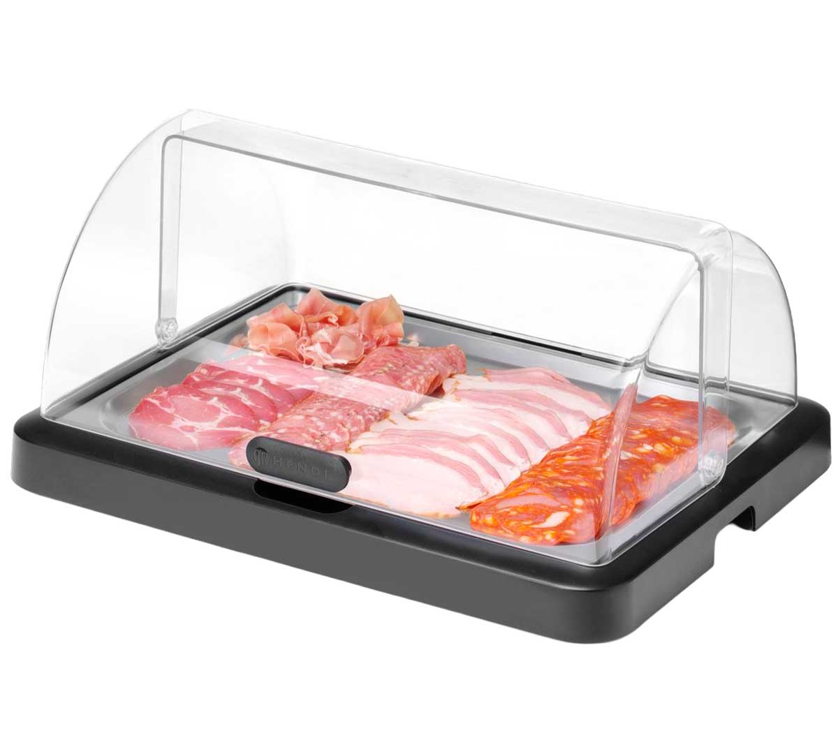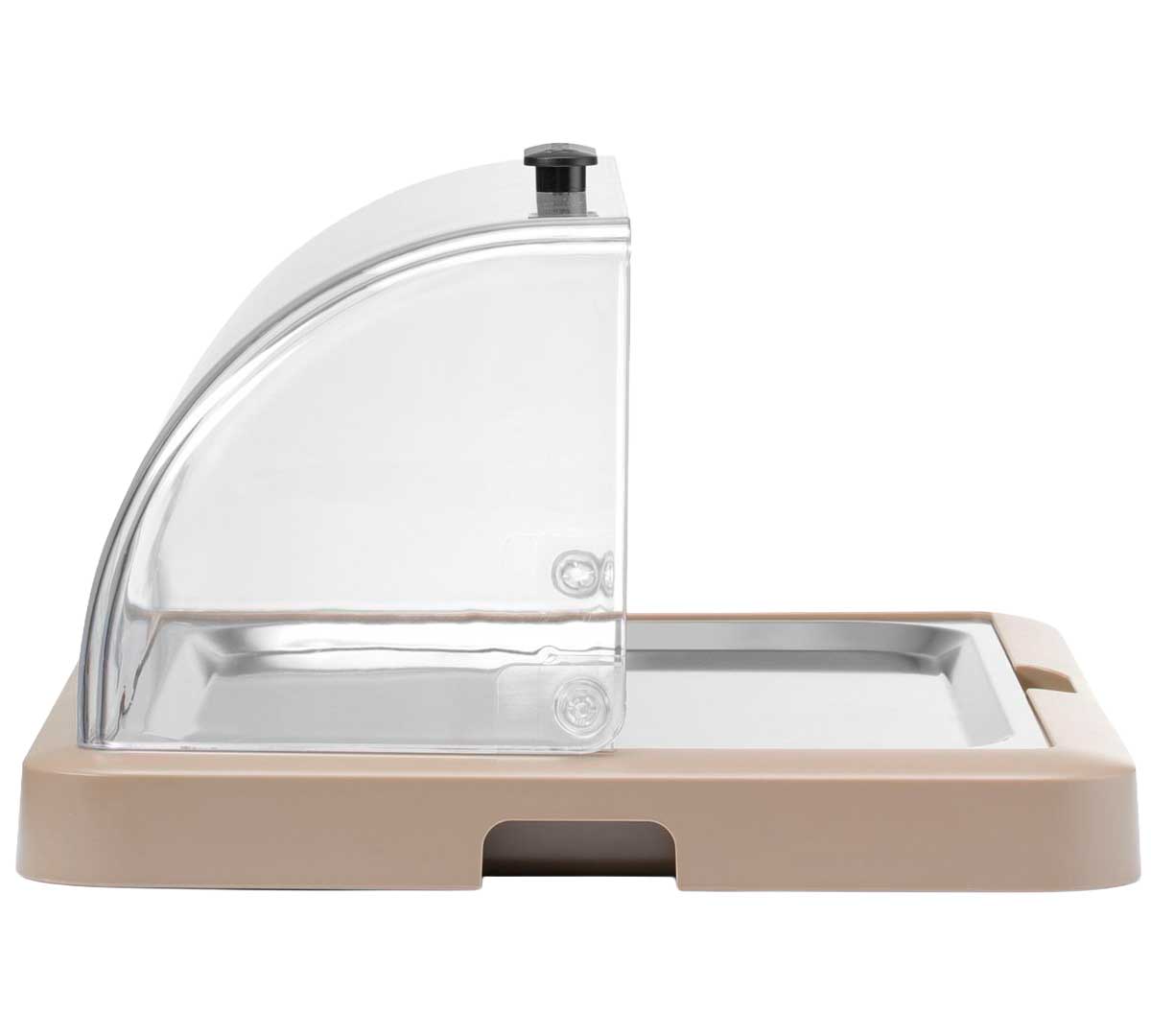 Expositor para buffet de 1 piso diseñado para presentar alimentos fríos de forma atractiva y funcional, con un diseño moderno. Tiene la tapa transparente de ABS enrollable que se abre hasta 90º y la carcasa es de polipropileno. Incluye bandeja de acero inoxidable con medidas 40 x 30 cm y 2 placas refrigerantes planas.