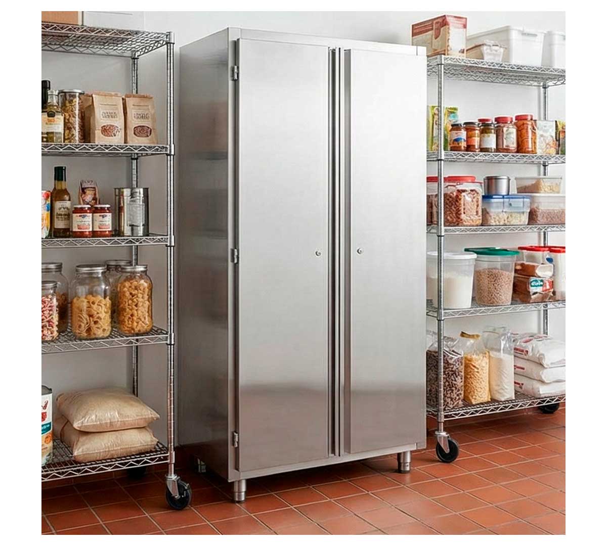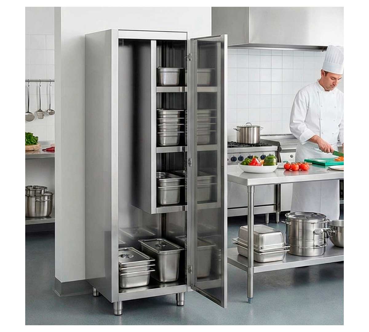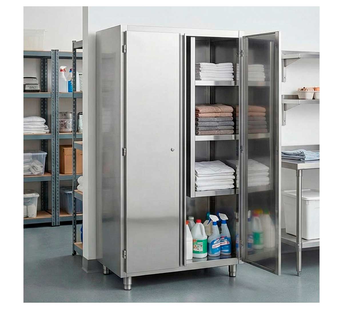 El Armario de Limpieza de Eratos está fabricado en acero inoxidable AISI 304 18/8 con acabado satinado. El acero inoxidable es un material muy utilizado en la fabricación de productos de hostelería debido a su durabilidad y resistencia.