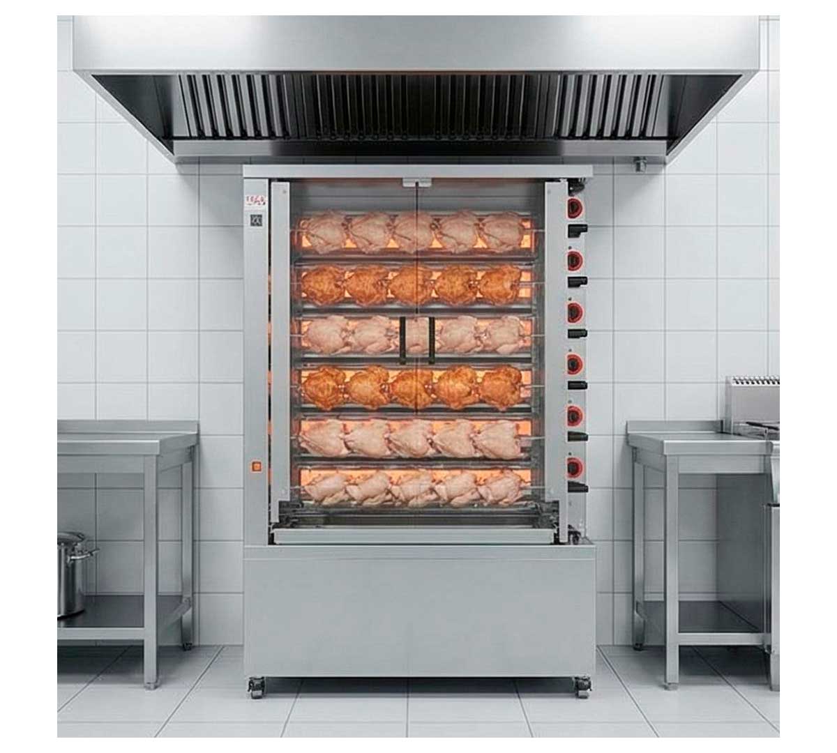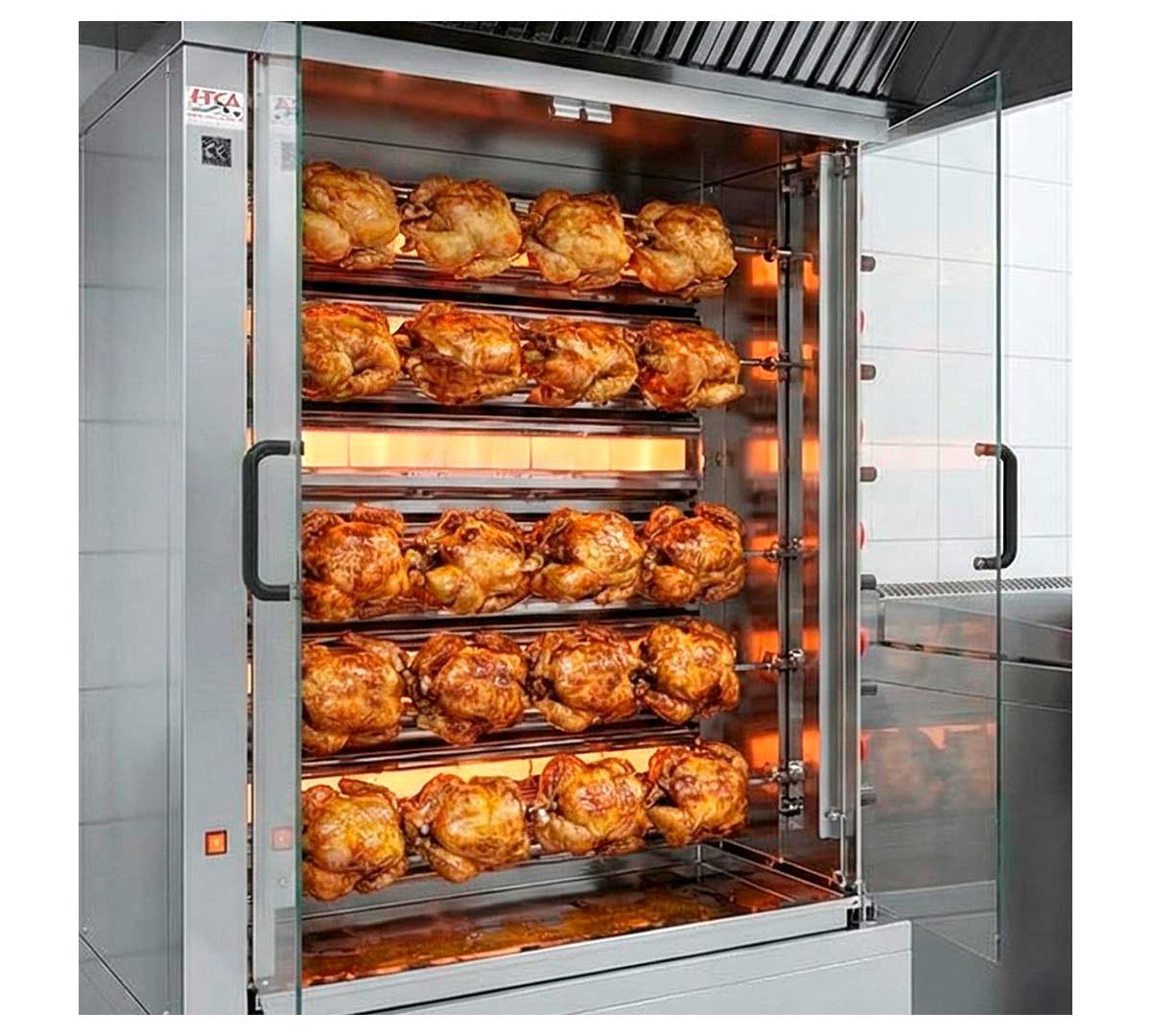 Asador a gas con una peana alta para facilitar el acceso a las espadas inferiores. Tiene una potencia de 40.000 Kcal/h. Con espacio para 30 a 36 pollos (en función de su colocación y tamaño). Incluye 6 espadas, 3 pinchos centrales y 2 pinchos laterales.