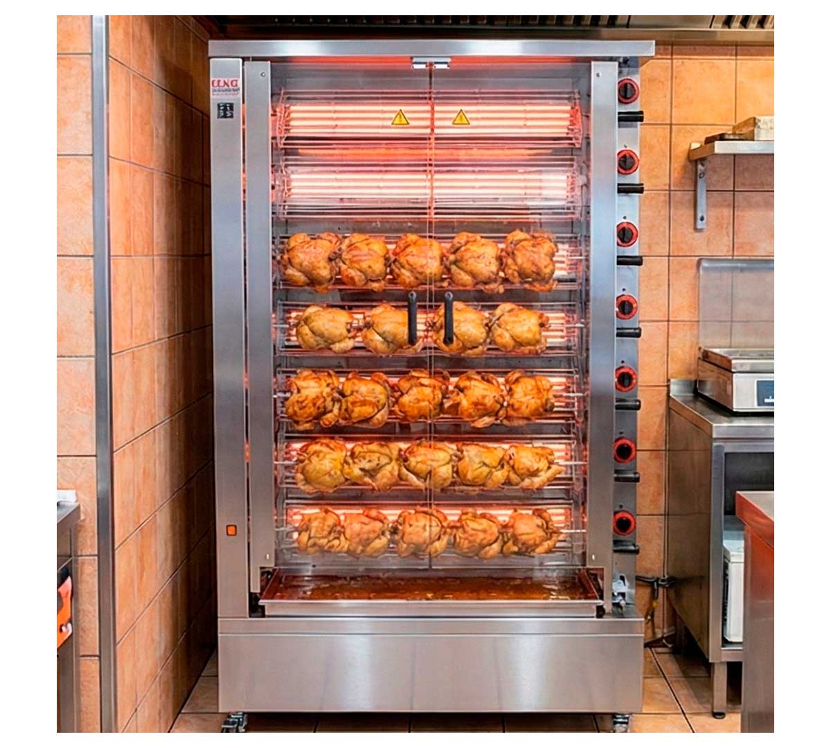 Este modelo de asador pertenece a la serie Eko. Un asador de diseño simple con transmisión a cadena. Incluye 7 jaulas especiales para colocar los pollos abiertos.