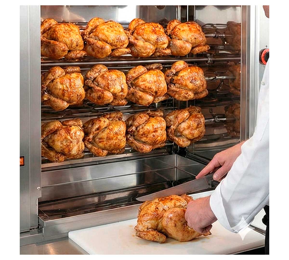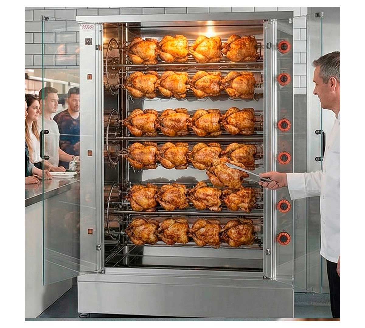 Es un asador a gas con motor eléctrico. El motor hace girar los pinchos para que los pollos se cocinen de manera uniforme. La capacidad del asador es orientativa ya que depende del peso y de la colocación de los pollos.