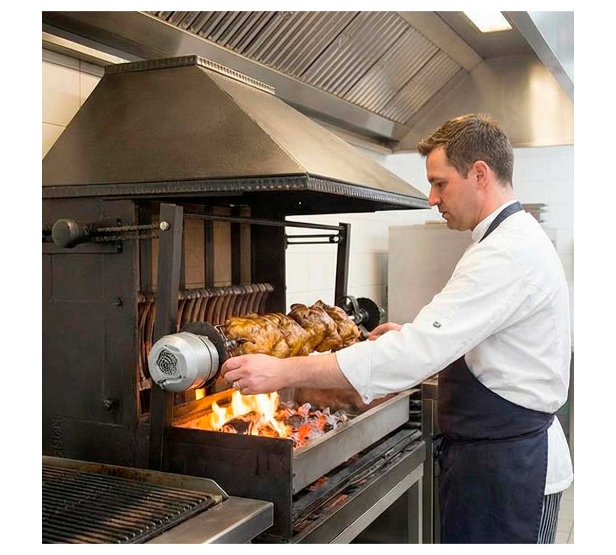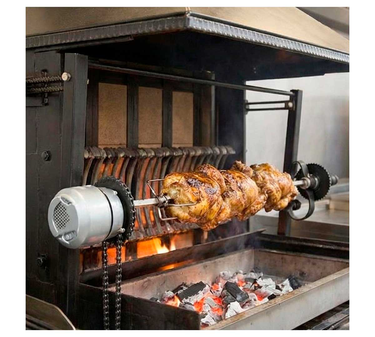 Asador de leña y barbacoa integrados en un solo aparato. Tiene 1 espada regulable. Con motor-reductor con tracción por cadena y piñones de acero.