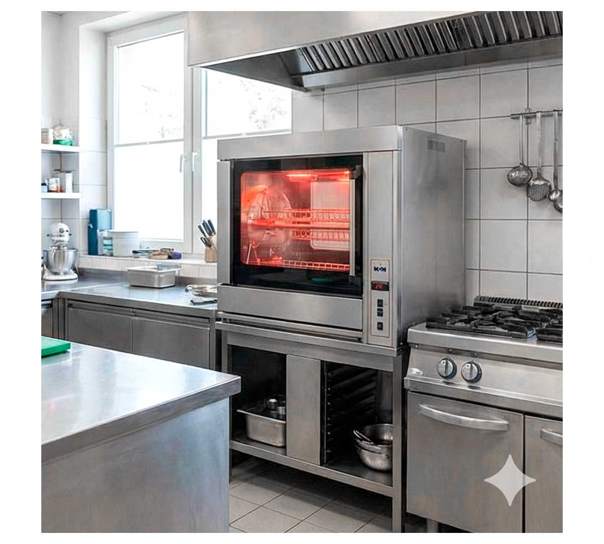 Asador de bajo consumo que no requiere extracción de humos. Fabricado en acero inoxidable con luz interior. De funcionamiento eléctrico mediante aire forzado para un asado uniforme. Disponible en dos modelos de 4 espadas o cestas.