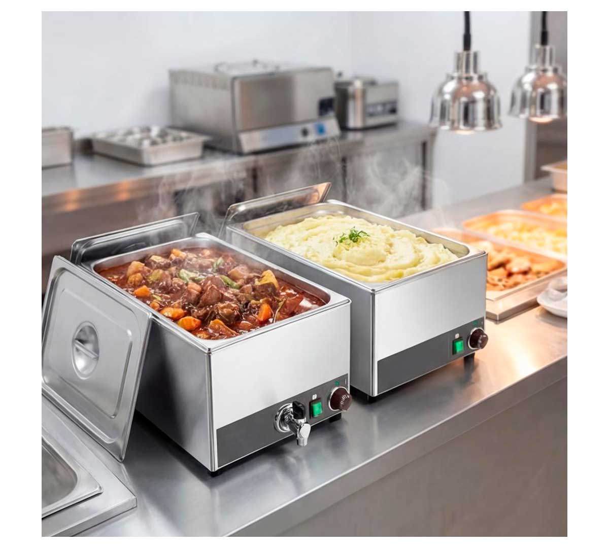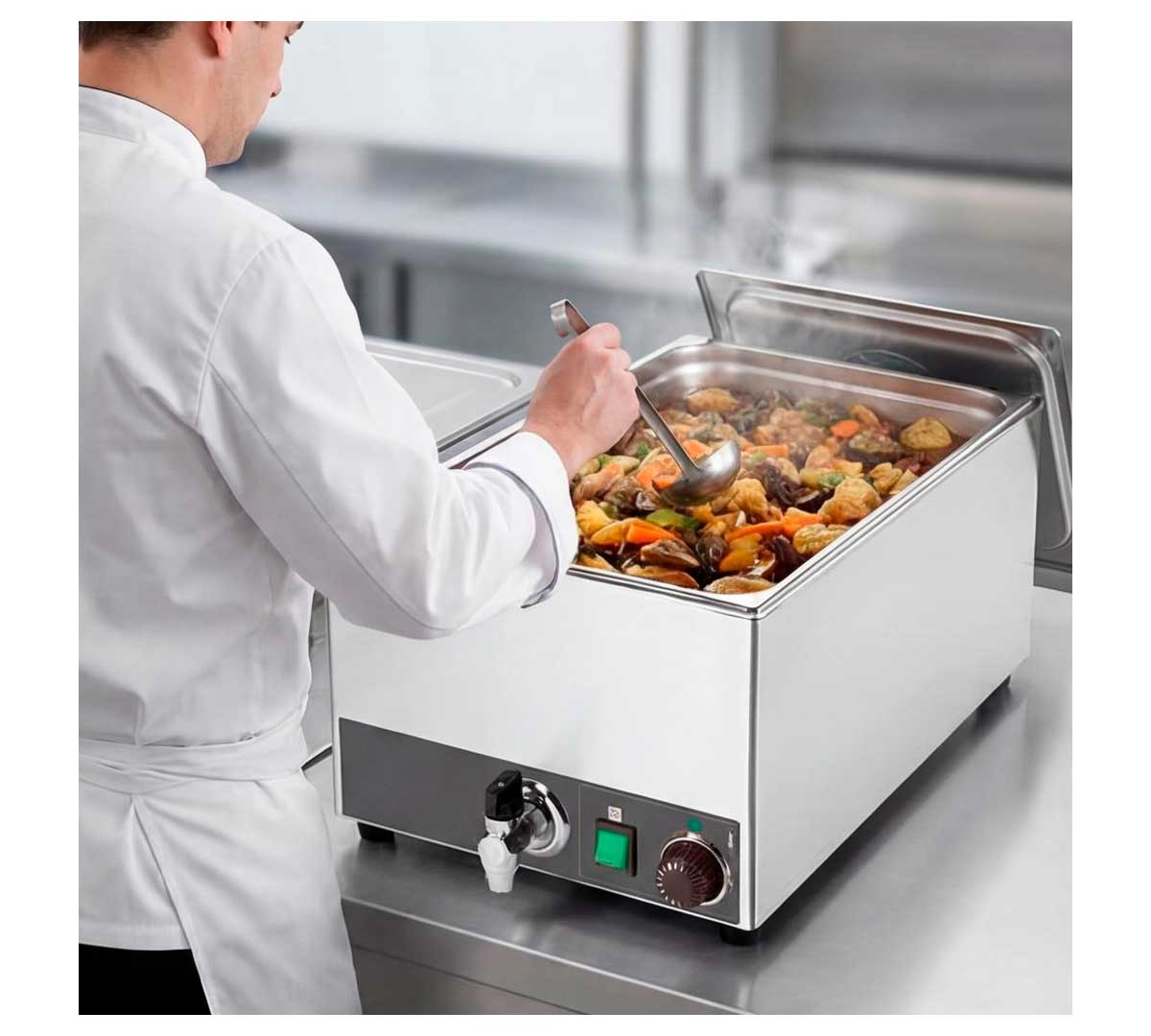 Baño maría de sobremesa fabricado en acero inoxidable. Es compatible con cubetas gastronorm GN 1/1. Equipado con termostato manual regulable hasta 90 ºC. Está disponible con o sin grifo.