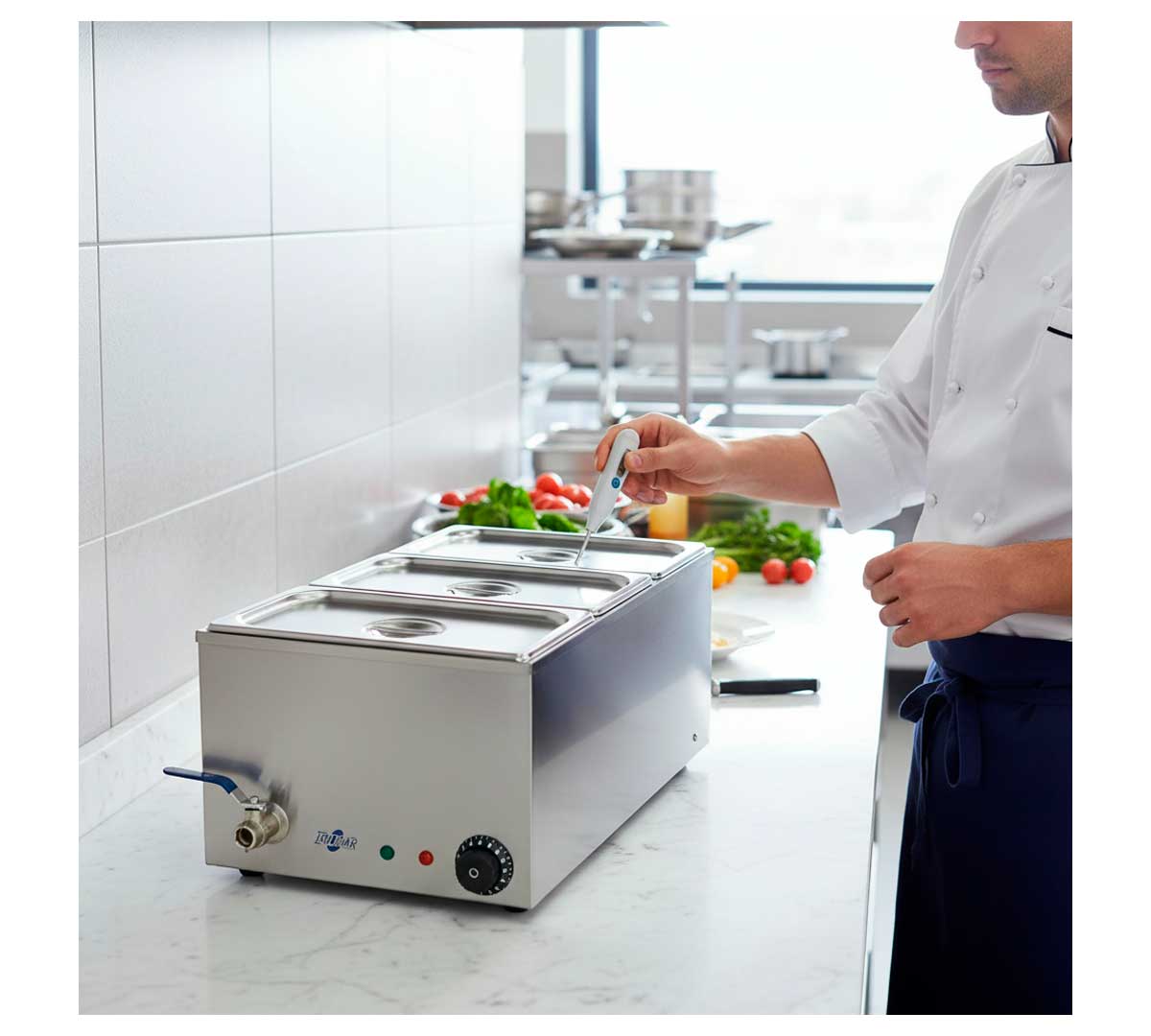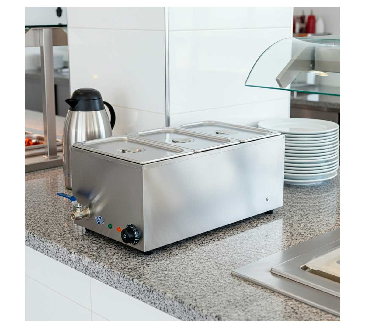 El baño maría BM eco 3 pertenece a la serie económica e incluye 3 cubetas GN 1/3 y sus tapas.