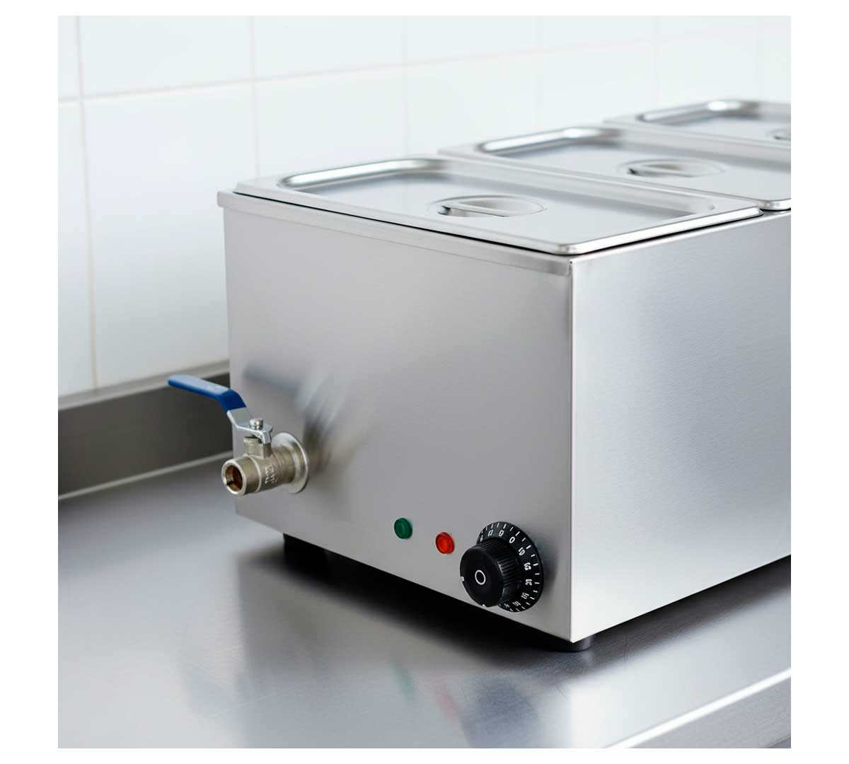 Baño maría de gama económica, con temperatura regulable entre 60 y 90 ºC. Con 3 cubetas extraíbles y grifo para el desagüe del agua.