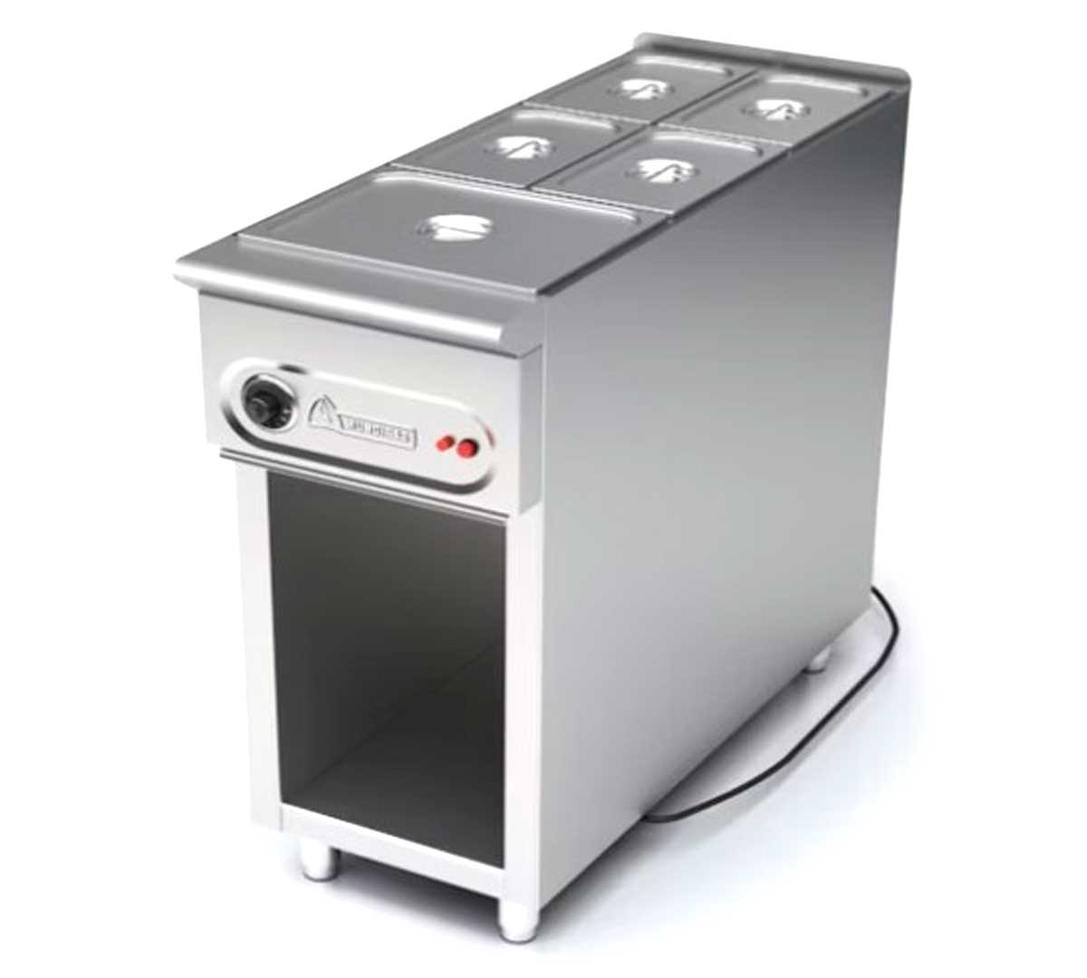 Este baño María eléctrico, también conocido como marmita de mantenimiento térmico, está diseñado para integrarse perfectamente en cocinas profesionales que requieren precisión y fiabilidad en la conservación de platos preparados.