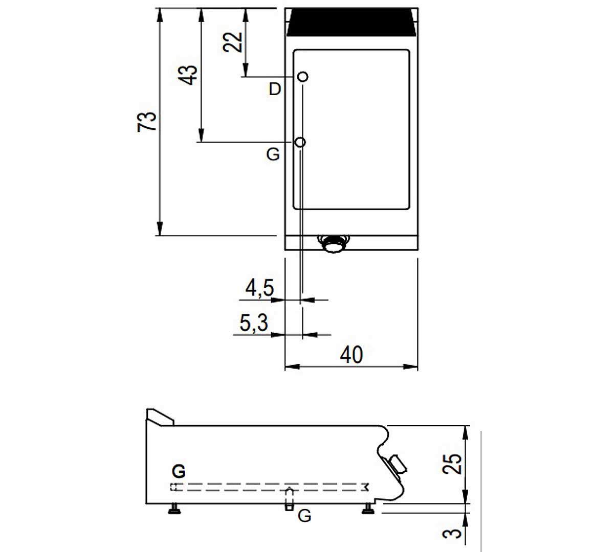 Baño María a gas de sobremesa en acero inoxidable, con control termostático y rango de temperatura de 30 a 90 °C. Incluye rebosadero. Admite cubetas GN de hasta 150 mm de altura.