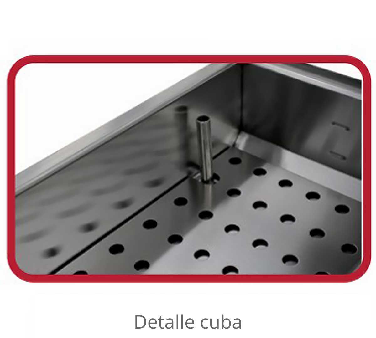 Este baño maría a gas está especialmente indicado para mantener calientes platos preparados, salsas, guarniciones y todo tipo de alimentos que requieran una temperatura constante y suave. Es perfecto para cocinas que necesitan trabajar con grandes volúmenes y mantener la calidad del producto hasta el momento del servicio, como en buffets, líneas de autoservicio, caterings y restaurantes con alta rotación.