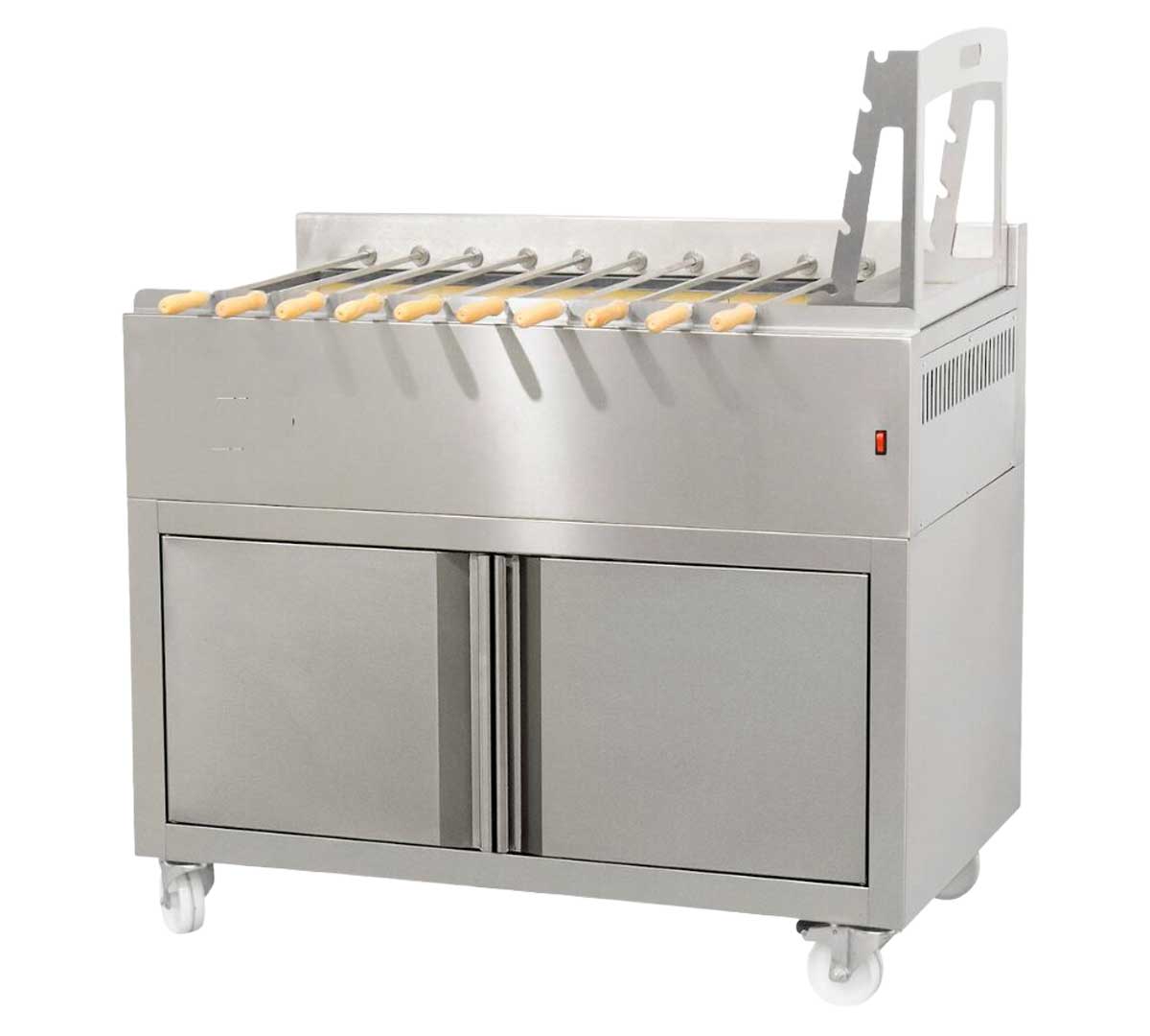 Parrilla de carbón con armario inox y ruedas. Equipada con sistema de espadas giratorias. Diseñada para cocinas profesionales que necesitan mayor capacidad de asado, movilidad y cocción uniforme sobre brasas.