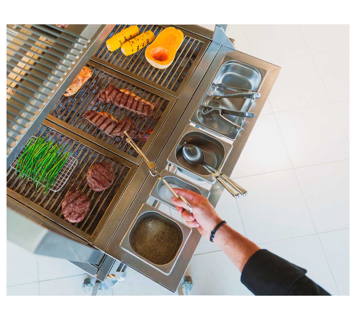 Este organizador para cubetas gastro está fabricado en acero inoxidable de alta calidad y se integra a la perfección con la estación de parrilla Grillstation, aportando una solución robusta, higiénica y de fácil acceso.