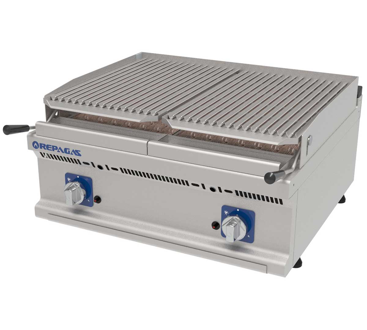 La Barbacoa de Sobremesa Serie 750 BARG-72/M Pro Professional Line de Repagas es una barbacoa profesional de sobremesa con dos zonas independientes, equipada con briquetas cerámicas, sistema recoge-grasas y diseño modular de gran rendimiento.