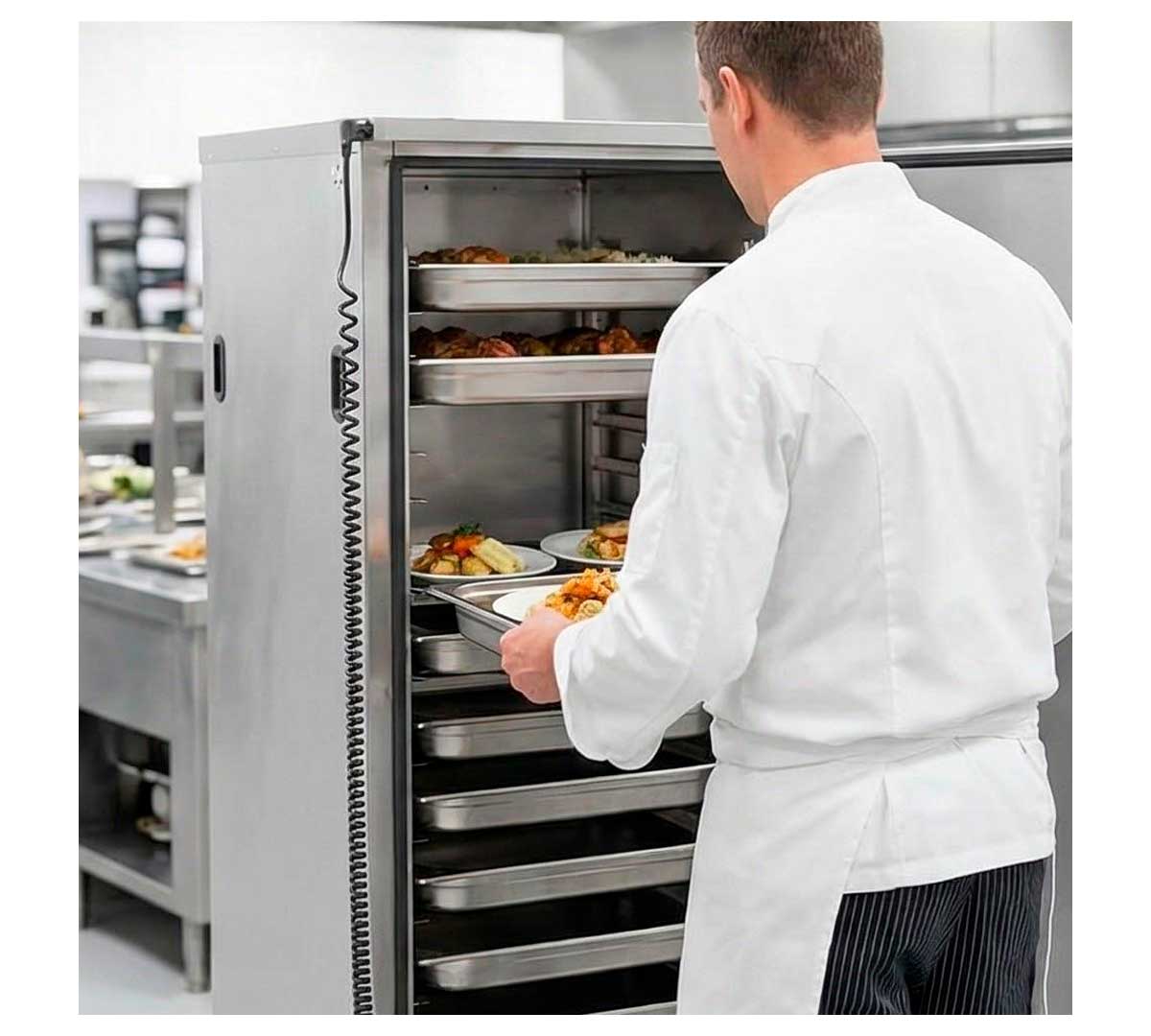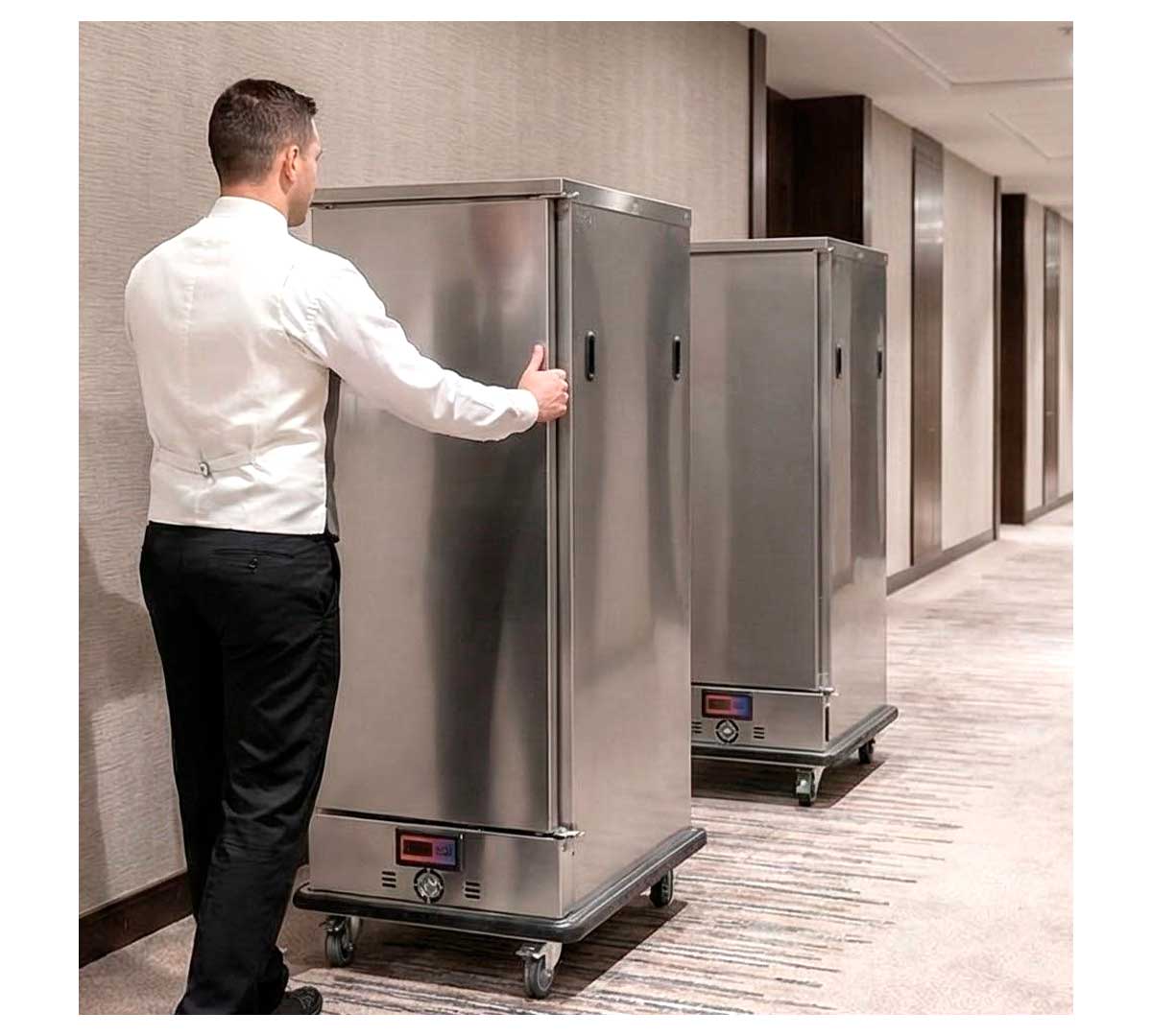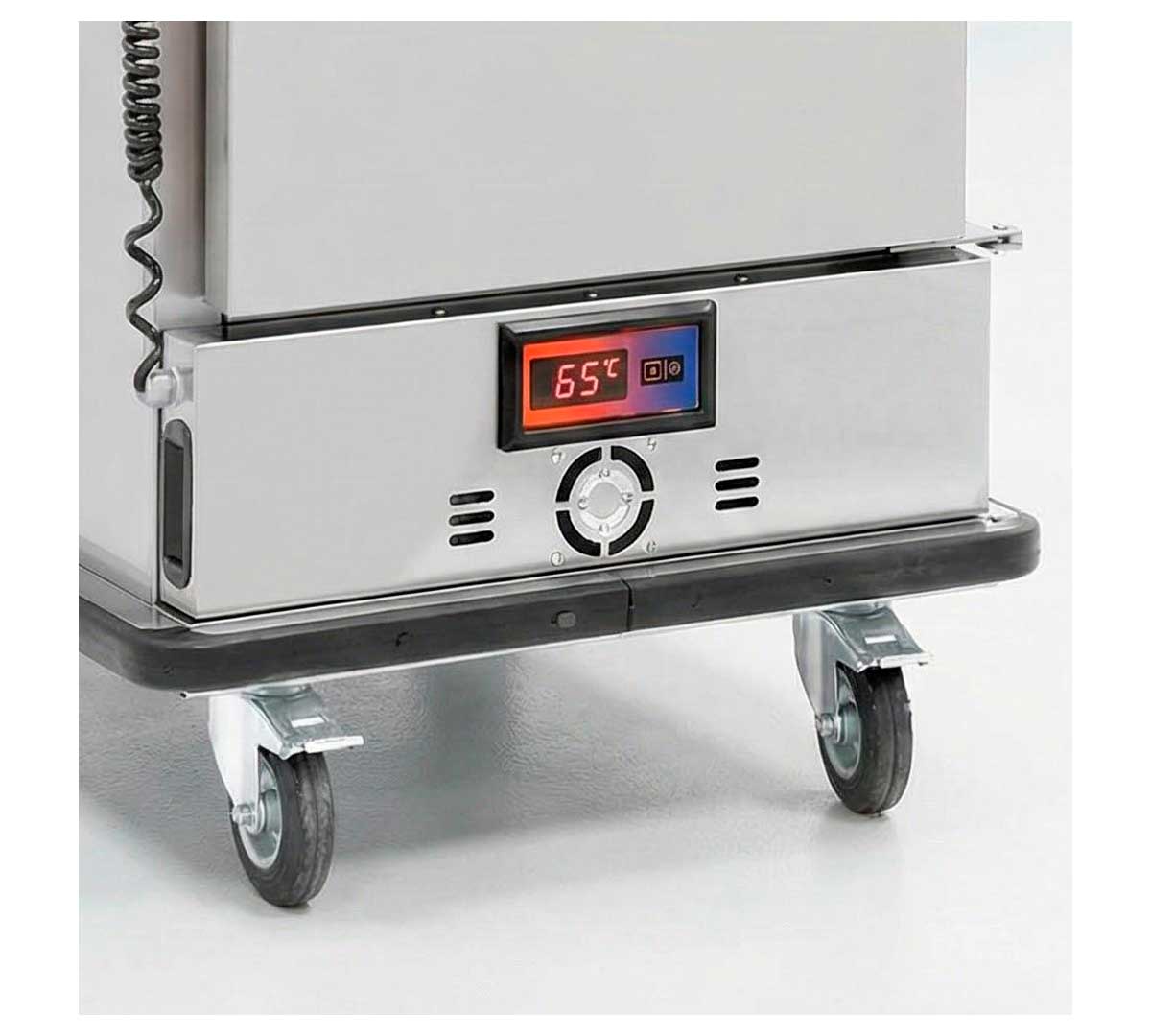 Carro caliente hermético, construido en acero inoxidable. El boque calórico es extraíble con resistencias ventiladas. Provisto de control digital y protección térmica de seguridad. Está disponible en dos modelos, con capacidad para almacenar 11 GN 2/1. El rango de temperatura es de 0 hasta 75 ºC. No incluye parrillas ni bandejas.