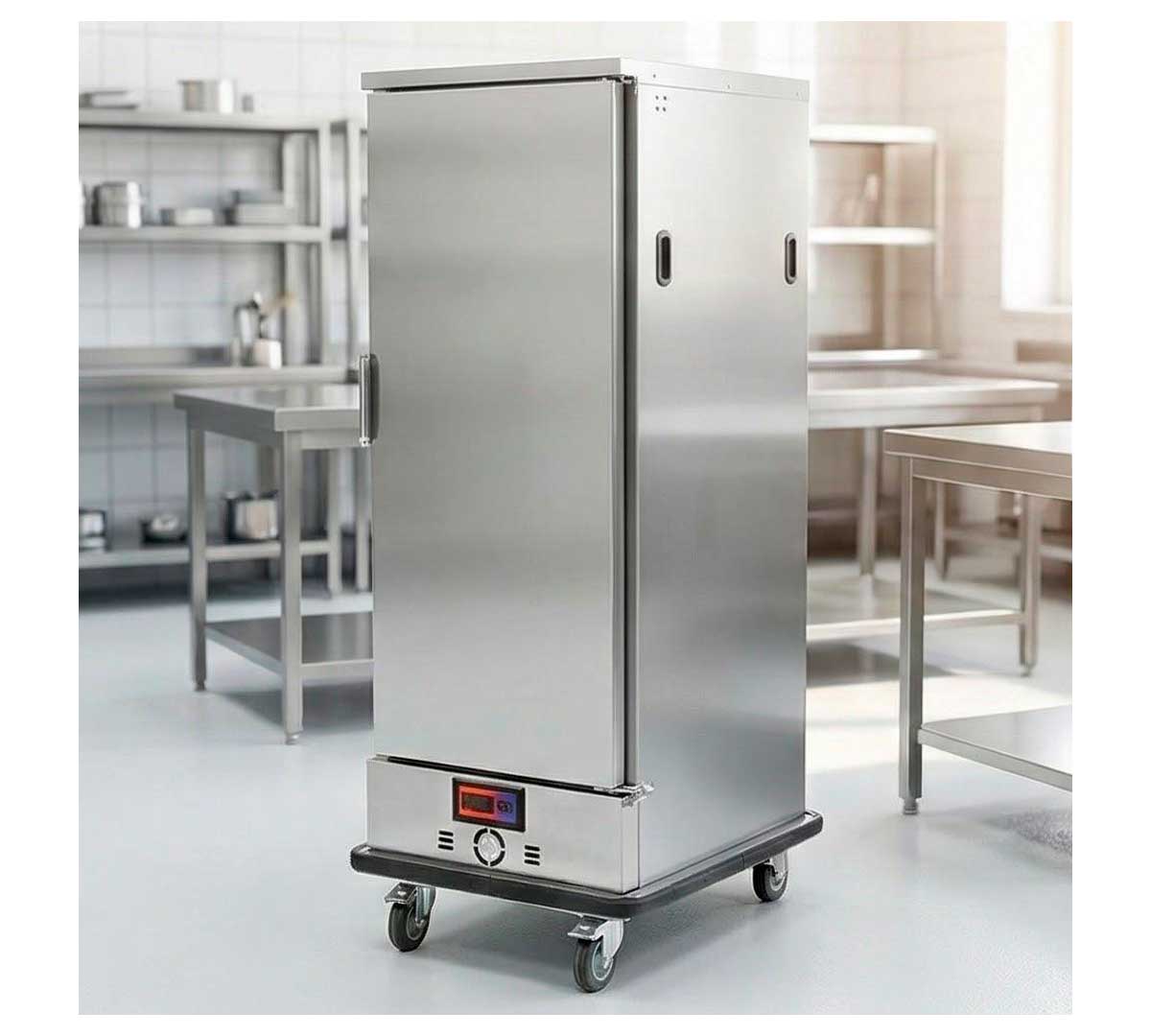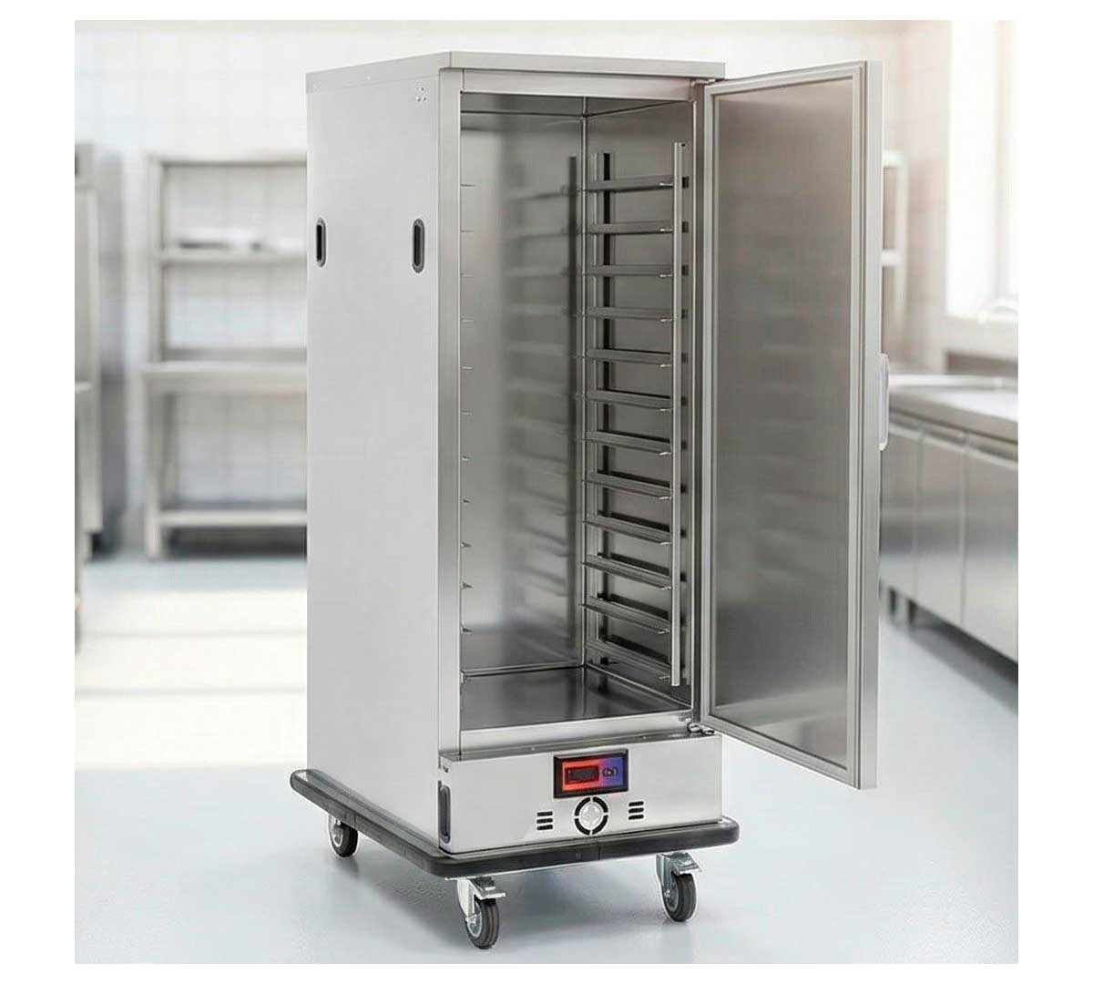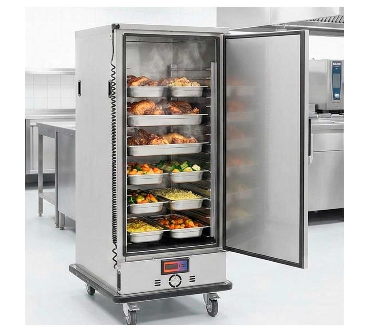 Carro caliente hermético, construido en acero inoxidable. El boque calórico es extraíble con resistencias ventiladas. Provisto de control digital y protección térmica de seguridad. Está disponible en dos modelos, con capacidad para almacenar 11 GN 2/1. El rango de temperatura es de 0 hasta 75 ºC. No incluye parrillas ni bandejas.