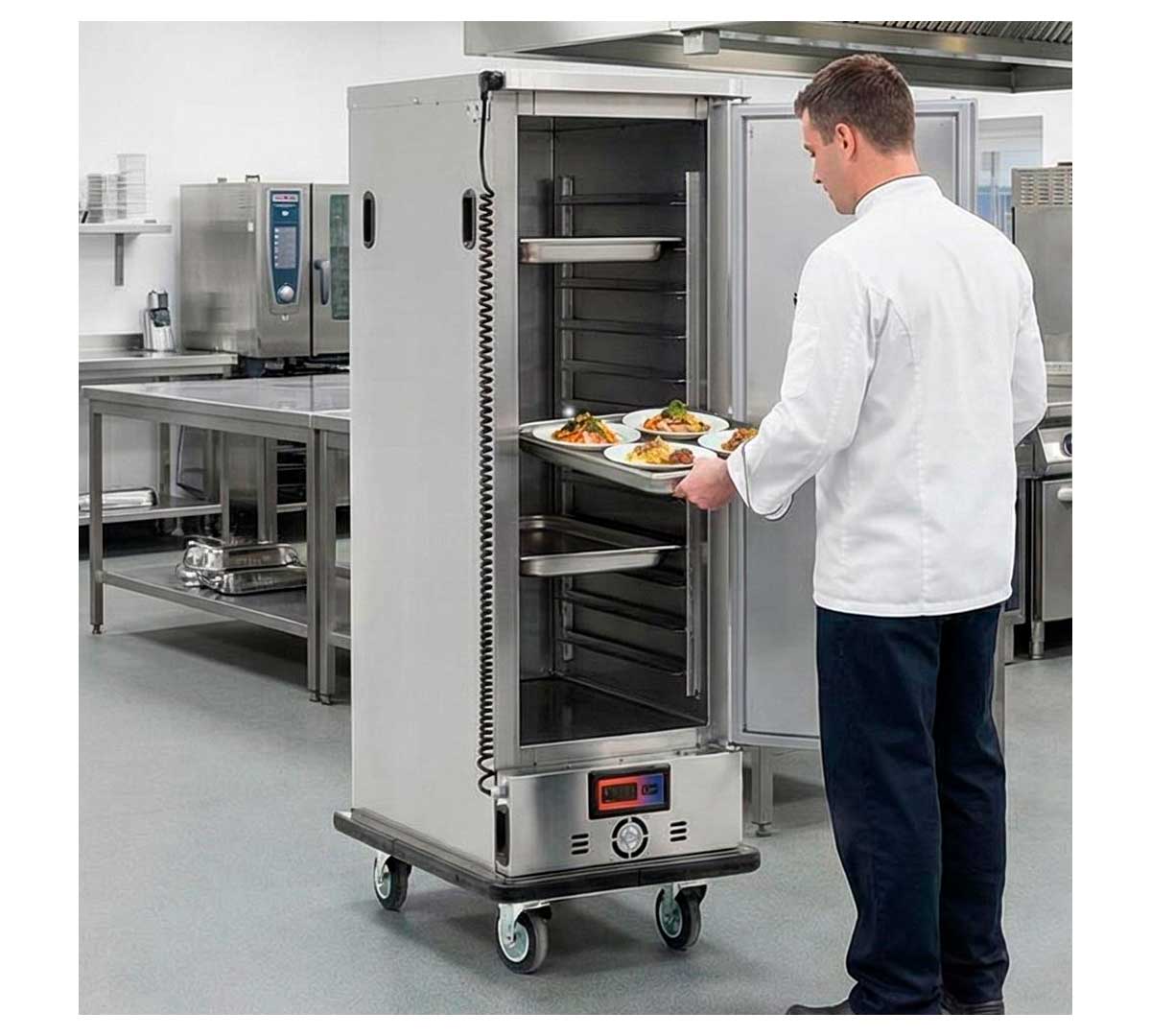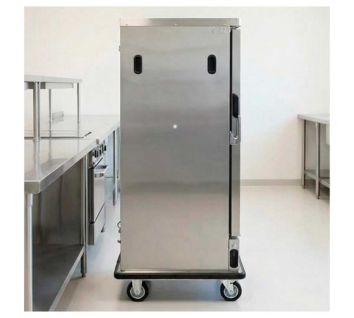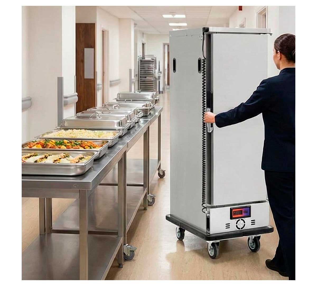 Carro caliente hermético, construido en acero inoxidable. El boque calórico es extraíble con resistencias ventiladas. Provisto de control digital y protección térmica de seguridad. Tiene capacidad para almacenar 15 GN 1/1. El rango de temperatura es de 0 hasta 75 ºC. No incluye parrillas ni bandejas.