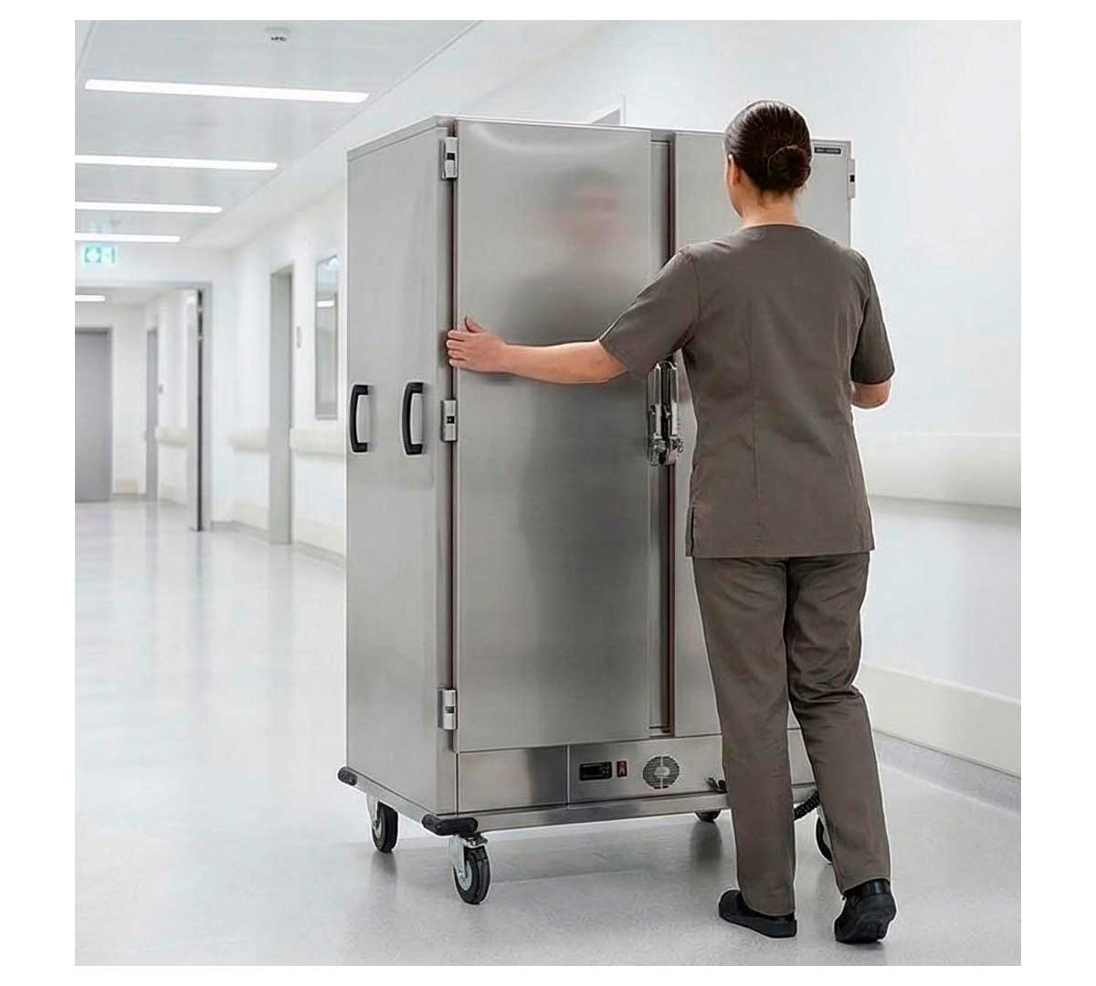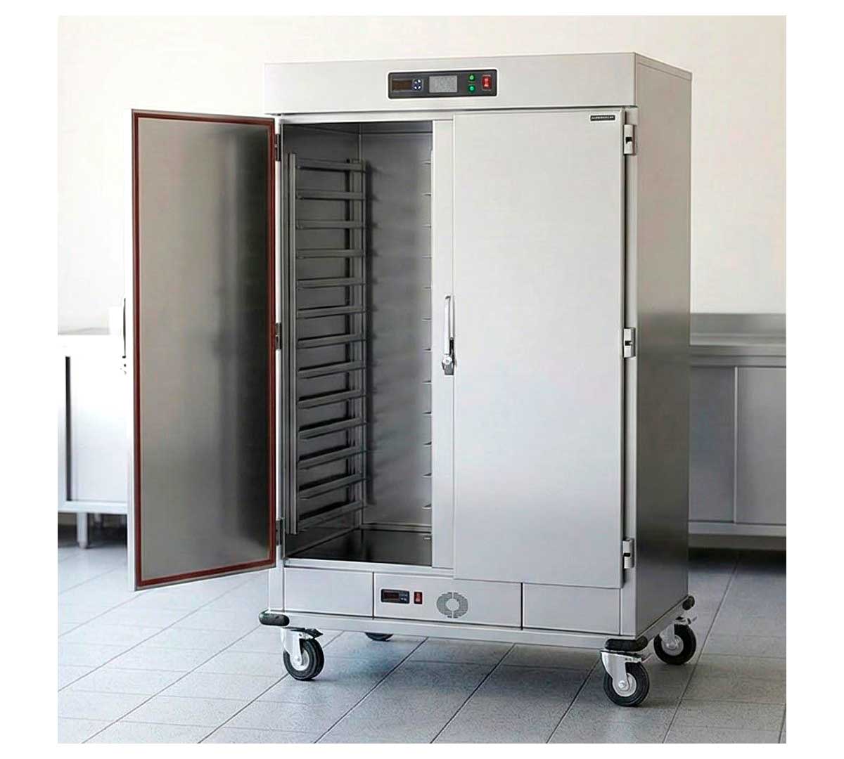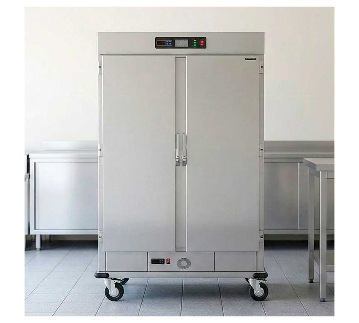Carro caliente para el transporte y servicio de platos preparados. Equipado con puerta y sistema de aislamiento con lana de roca. La puerta puede abrirse hasta los 270º. Está disponible en 2 modelos con capacidad de 34 o 44 Bandejas GN 2/1.