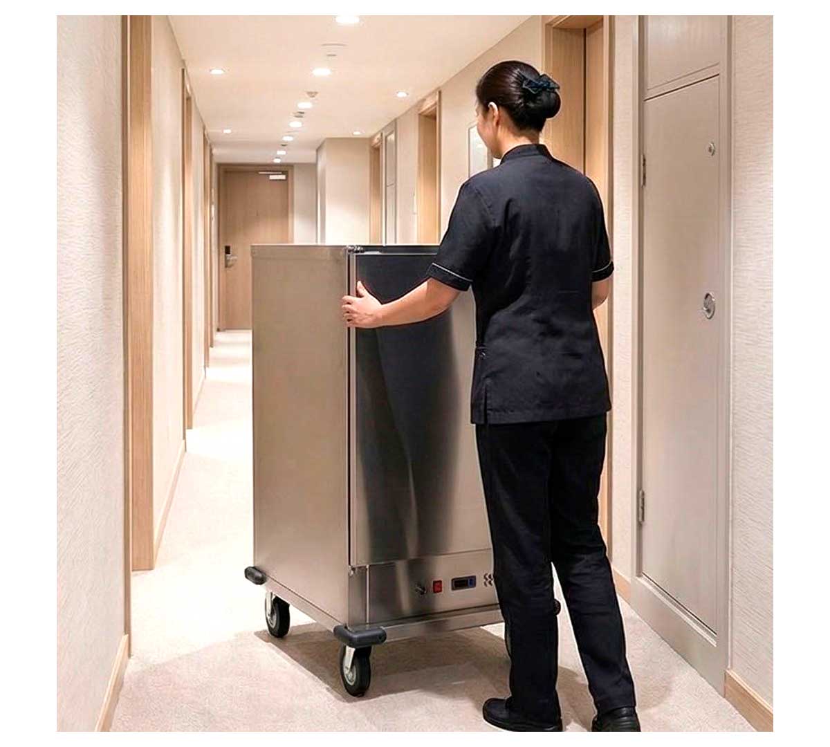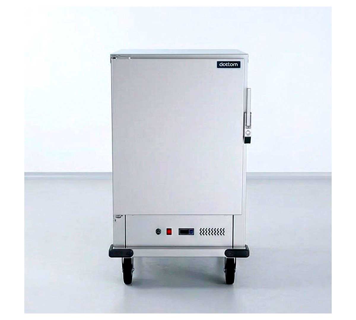 Carro caliente para el transporte y servicio de platos preparados. Tiene capacidad para 11 bandejas gastronorm GN 2/1 o 22 bandejas GN 1/1. Equipado con puerta y sistema de aislamiento con lana de roca. La puerta puede abrirse hasta los 270º.