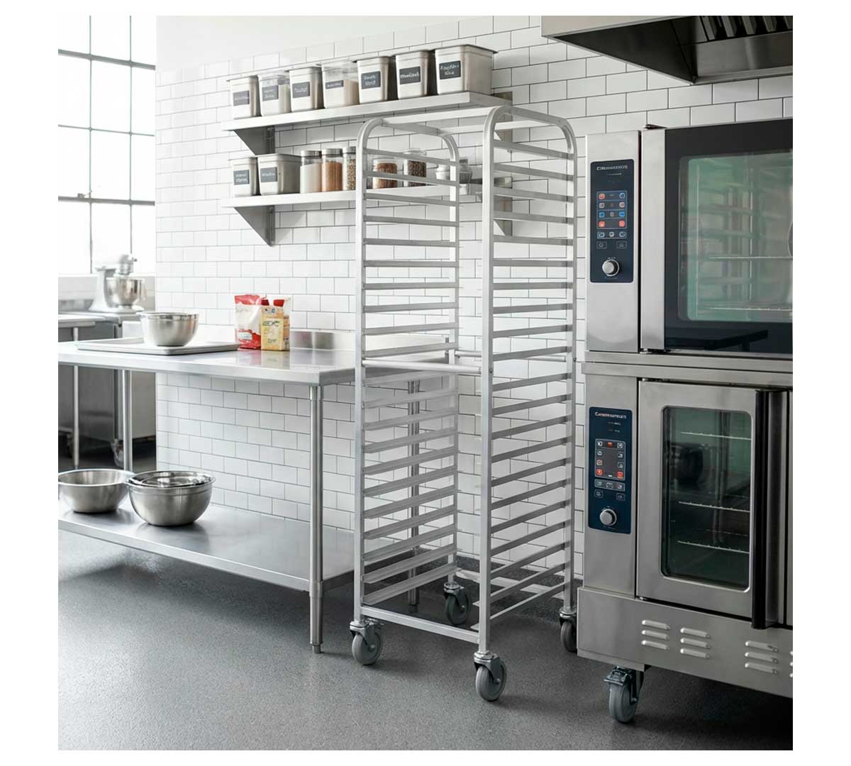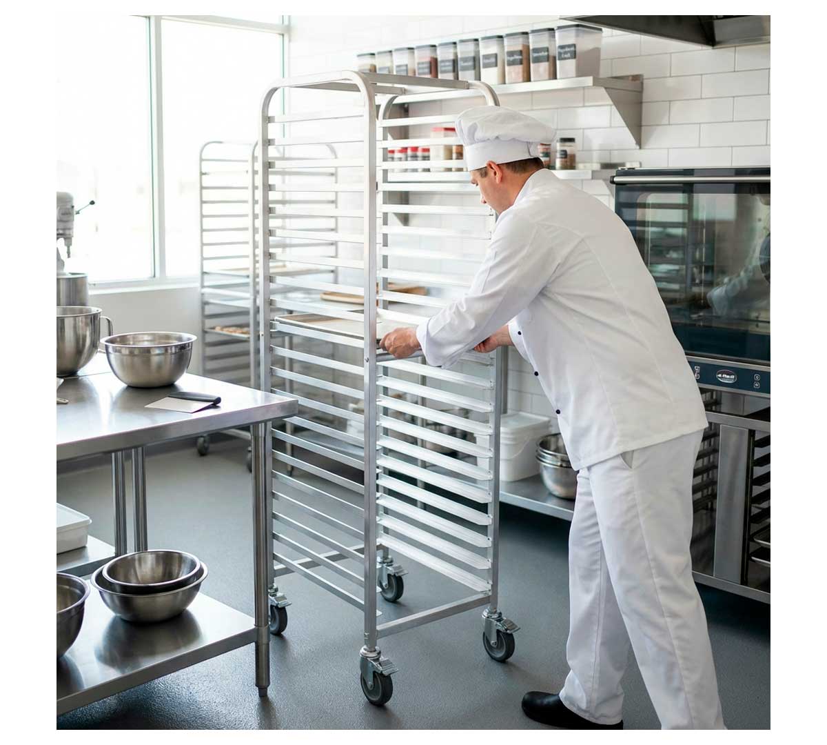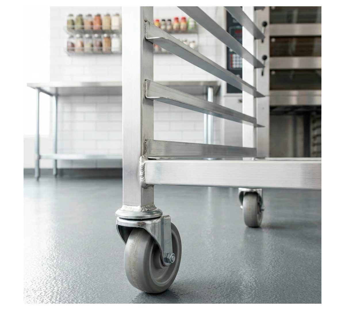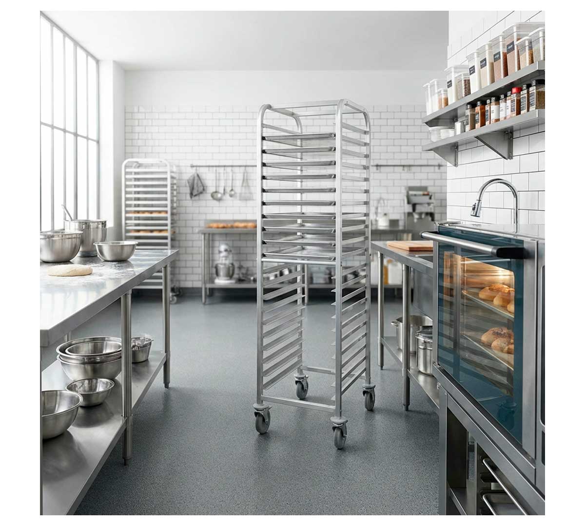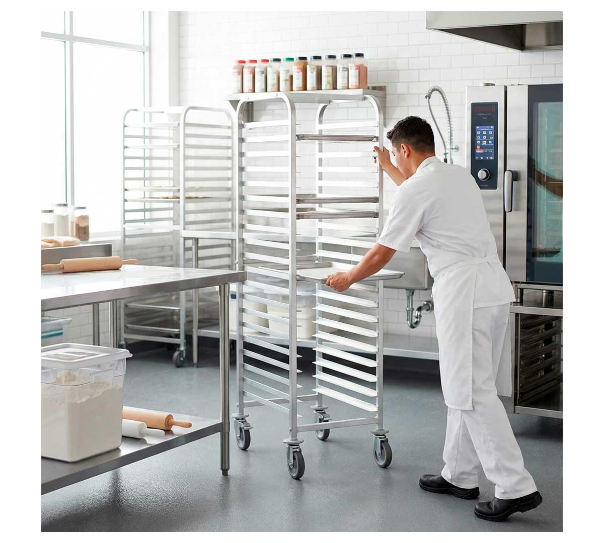 Carro alto porta bandejas fabricado en acero inoxidable satinado. Con capacidad para 20 bandejas pasteleras con medidas 60 x 40 cm. Las bandejas no están incluidas. Está disponible montado o desmontado.