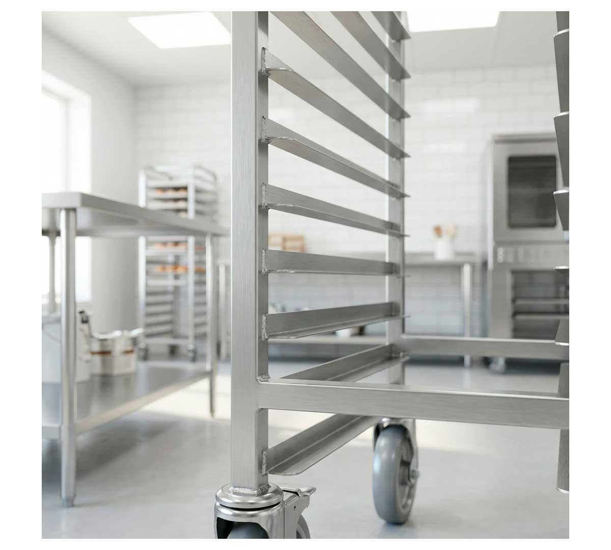 El Carro Alto Pastelero de Eratos está fabricado en acero inoxidable satinado.
